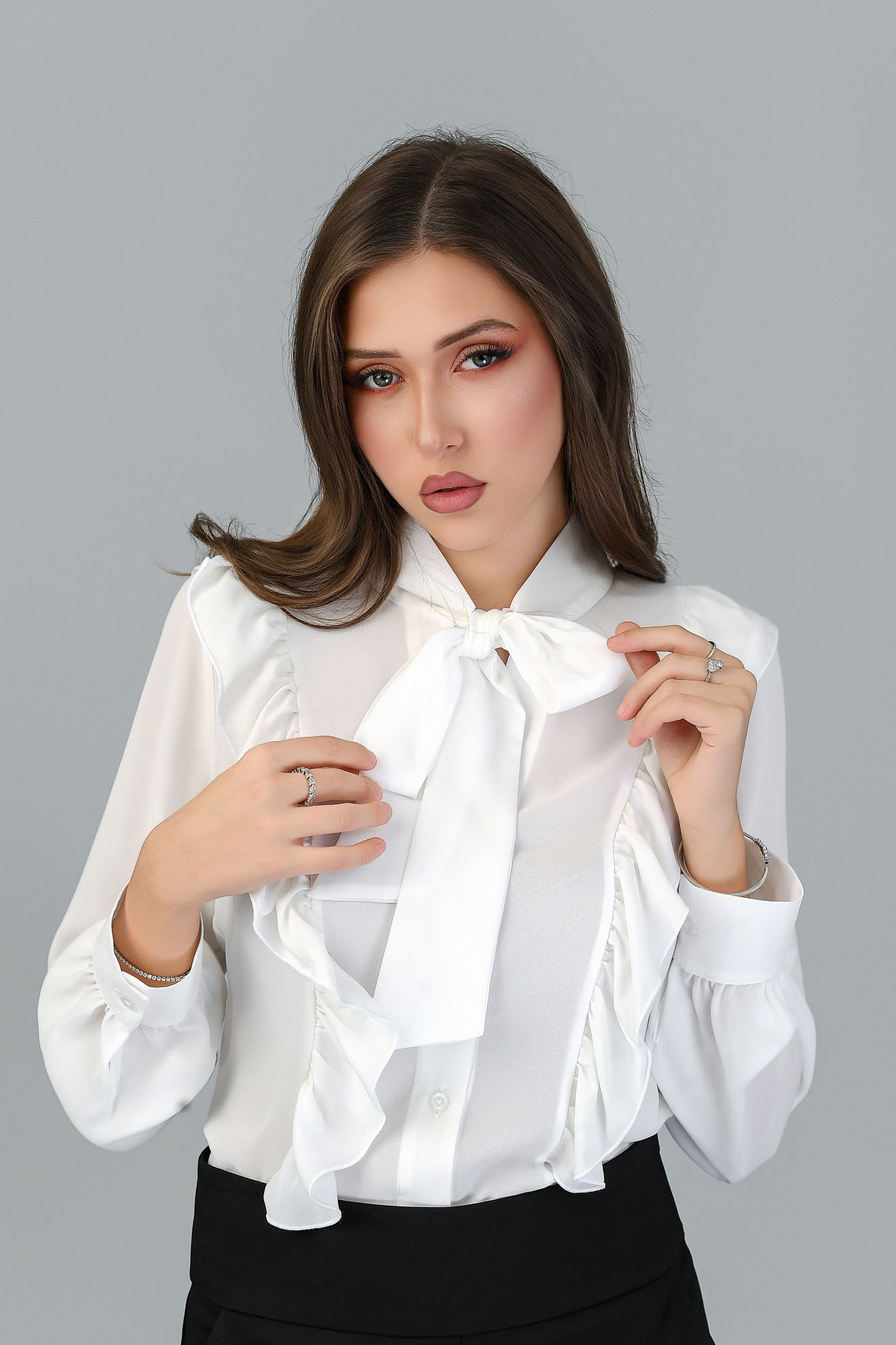 Confecționată din voal dens, plăcut la atingere, în croi cambrat, mâneci lungi, accesorizată cu volane și jabou la baza gâtului.