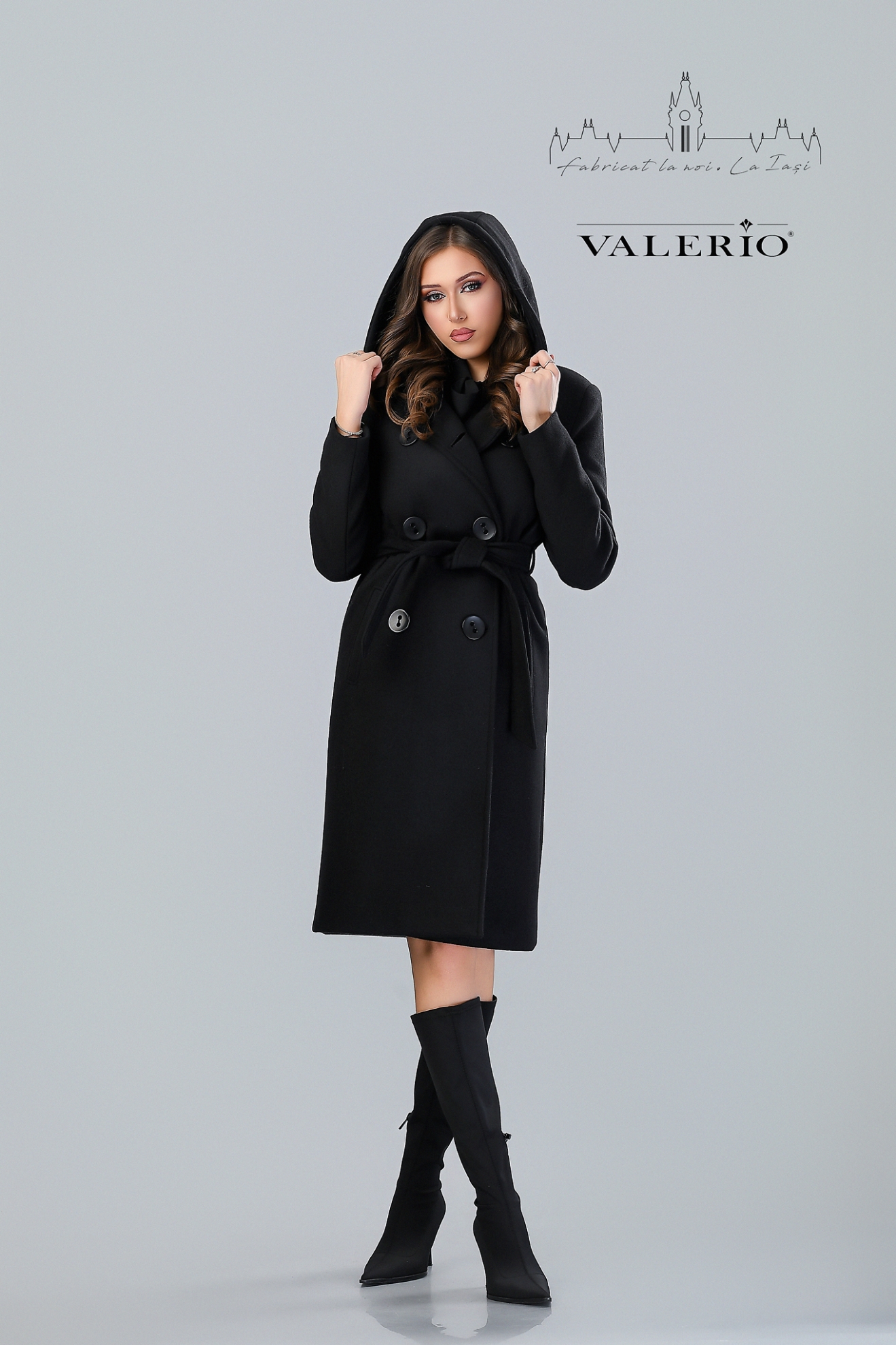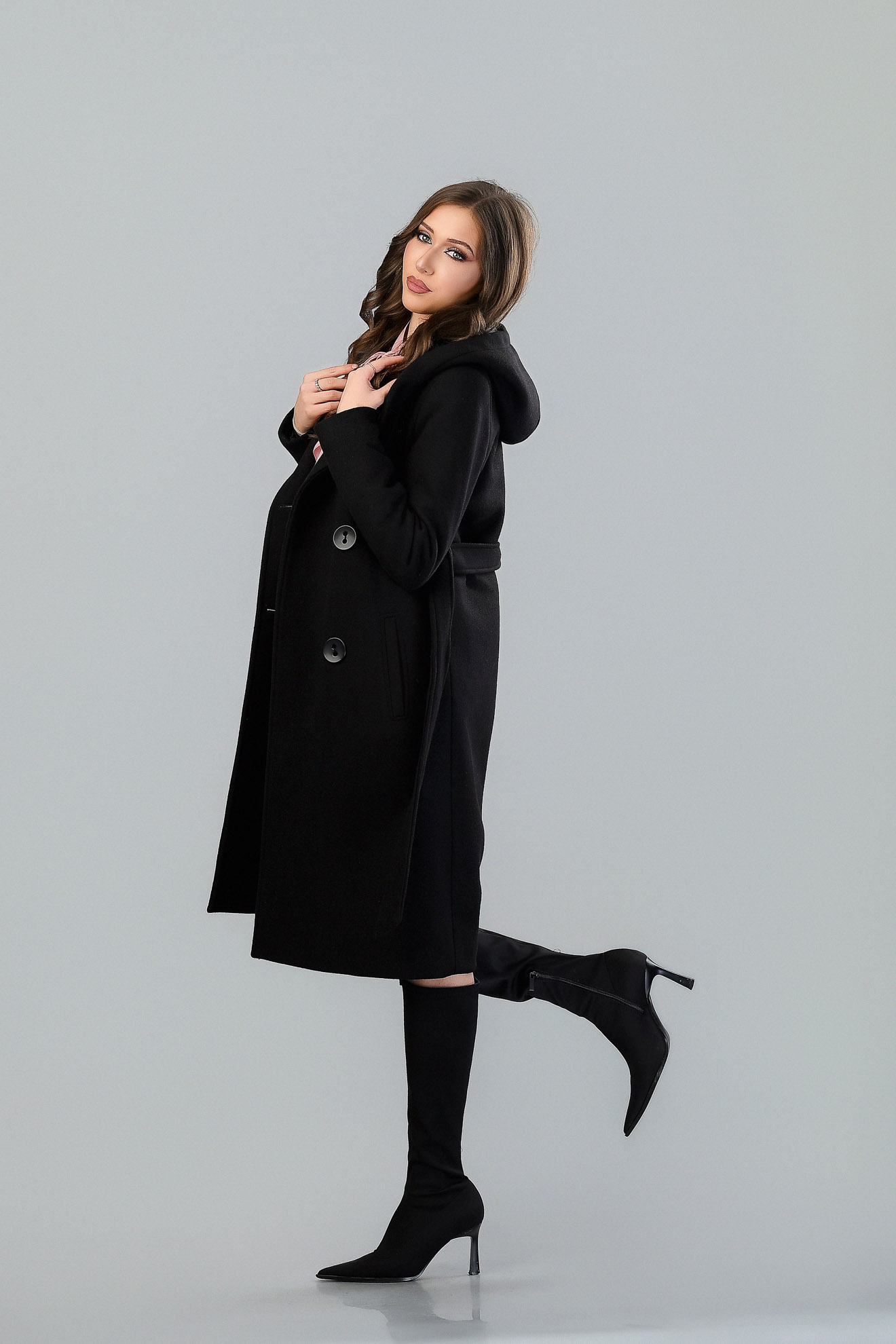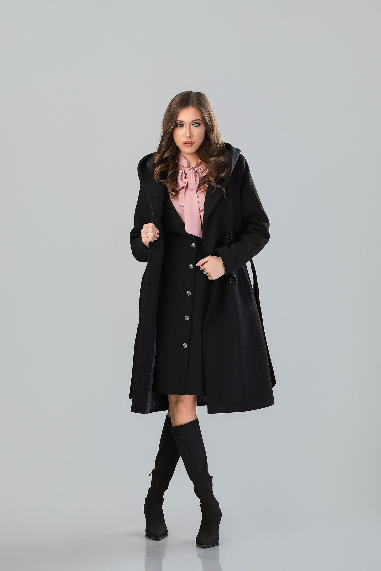 Confecționat din stofă de calitate superioară, cu lână în compoziție, în croi lejer, cu glugă, căptușit, matlasat, suprapus cu două rânduri de nasturi, prevăzut cu buzunare și cordon în talie.