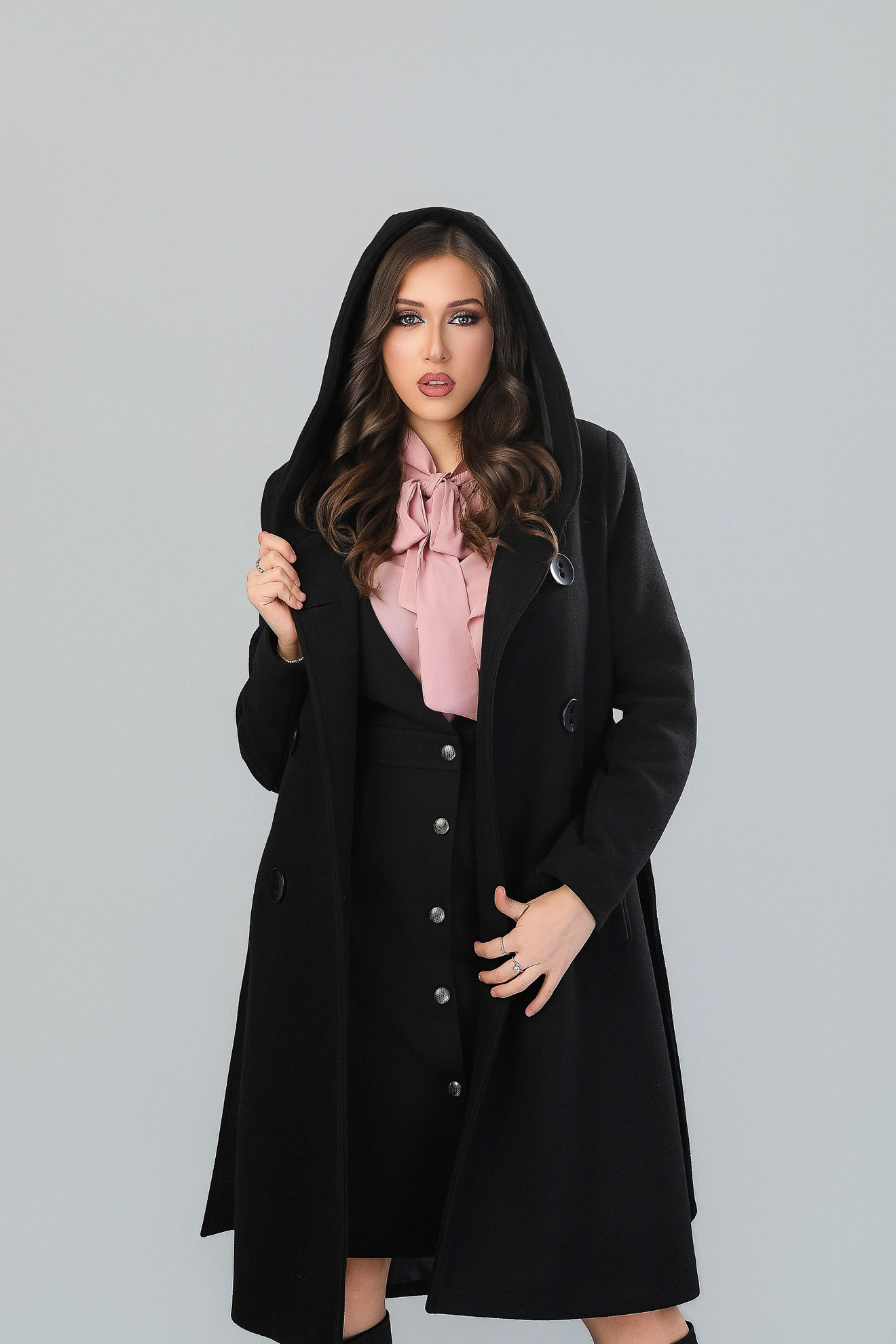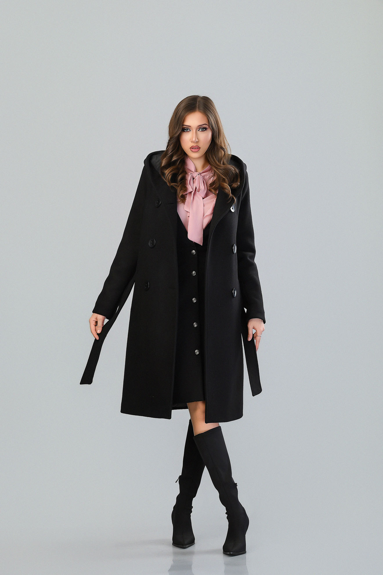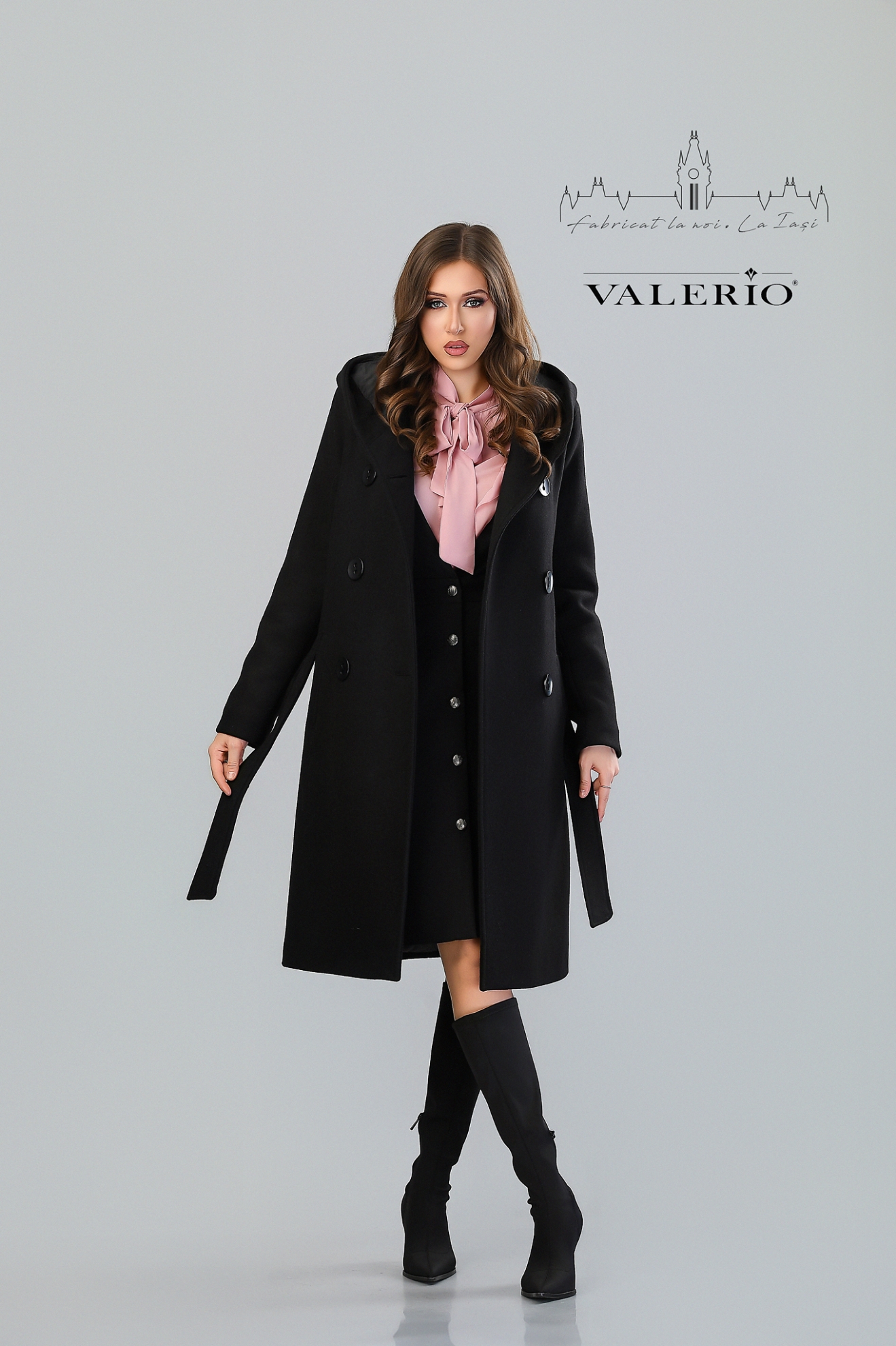 Confecționat din stofă de calitate superioară, cu lână în compoziție, în croi lejer, cu glugă, căptușit, matlasat, suprapus cu două rânduri de nasturi, prevăzut cu buzunare și cordon în talie.