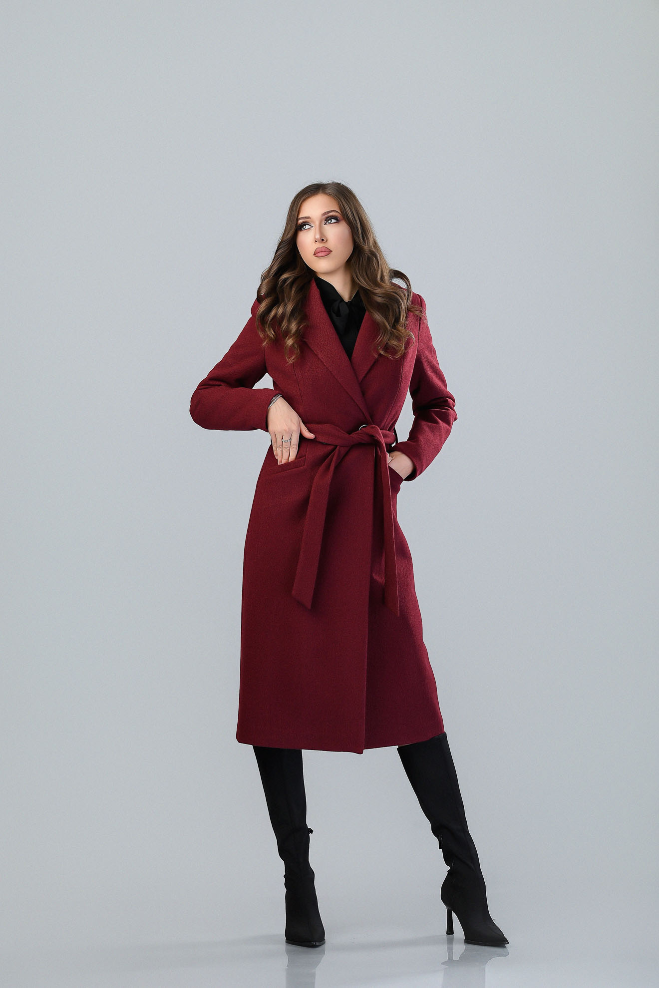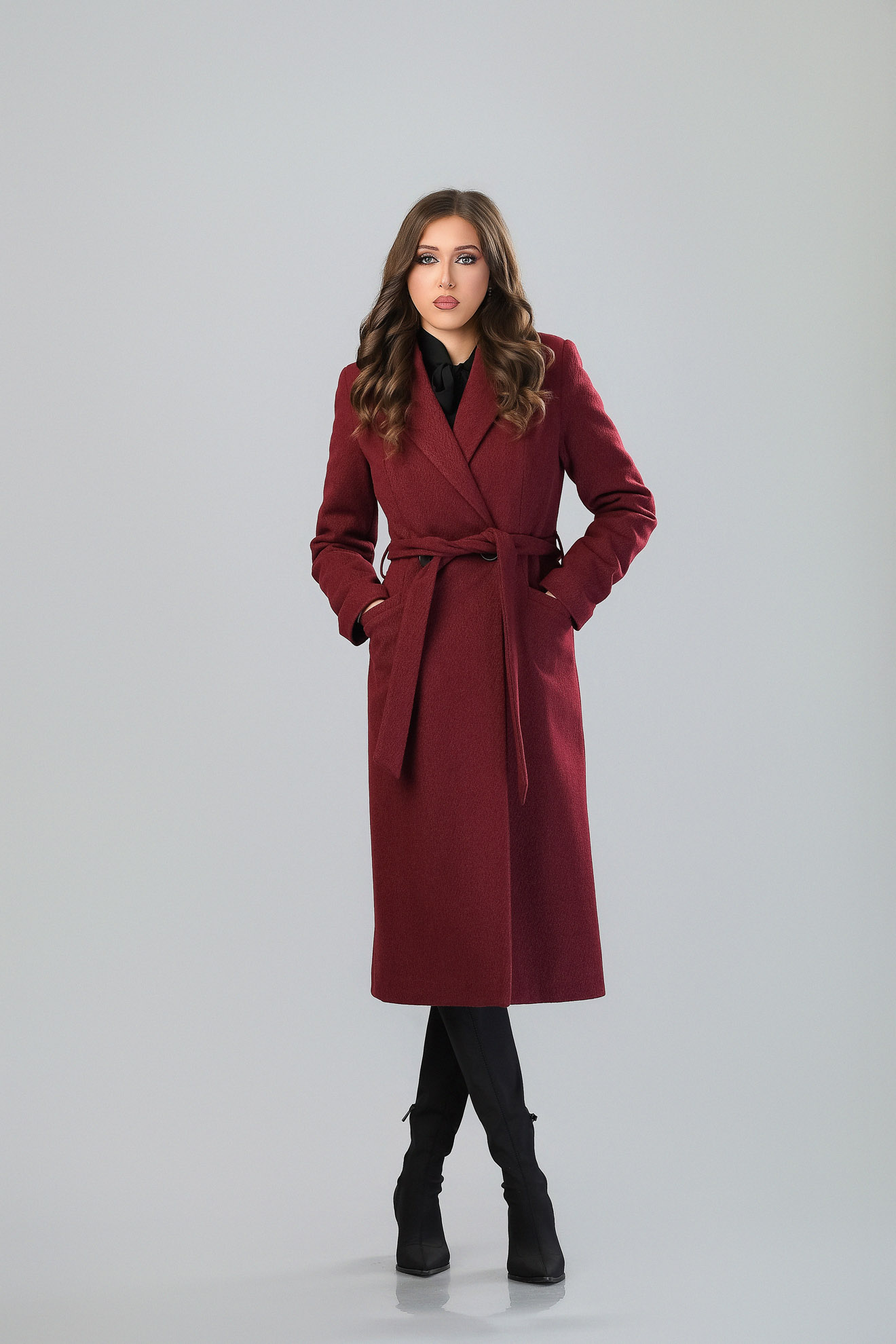 Confecționat din stofă de calitate superioară, cu lână în compoziție, în croi cambrat, căptușit, matlasat, prevăzut cu buzunare și cordon în talie.