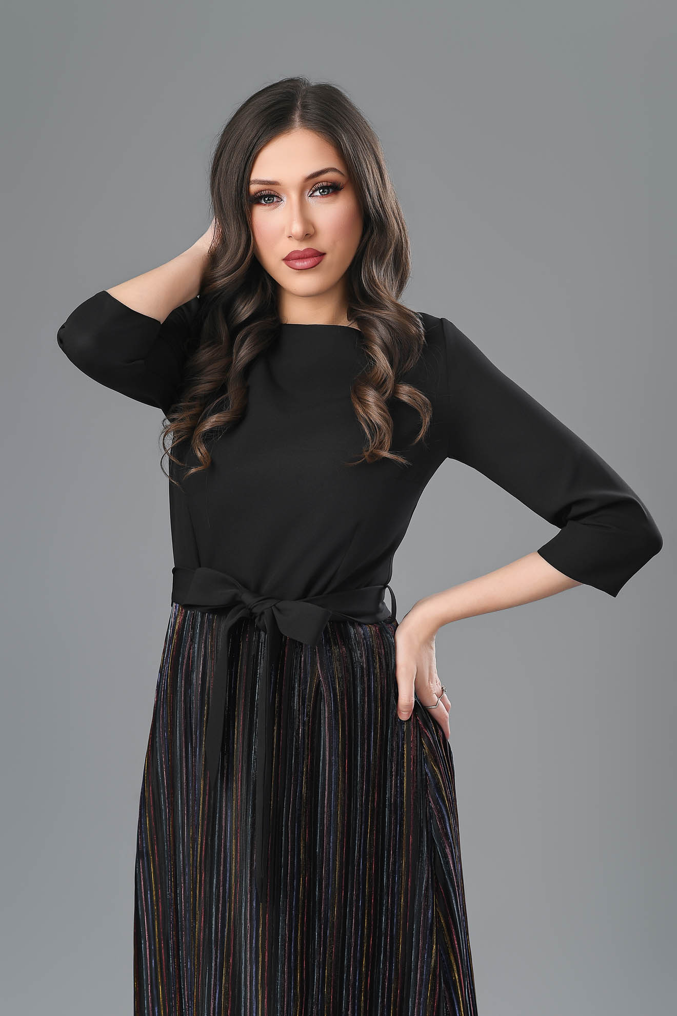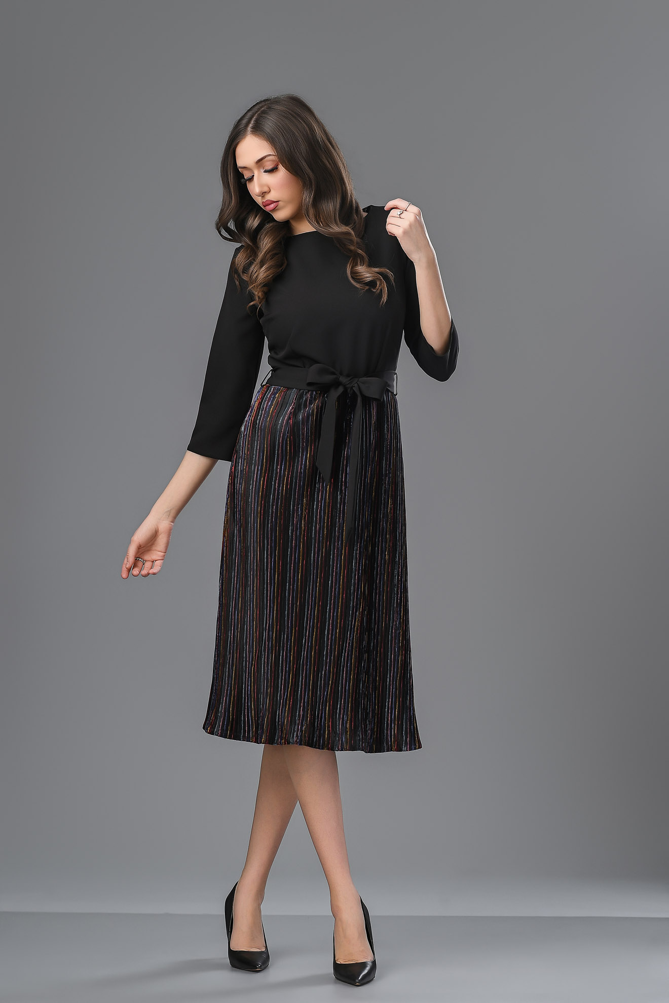 Confecționată din stofă neagră în partea de sus și cu țesătură multicoloră plisată în partea de jos, în croi lejer, în A, se încheie la spate cu fermoar ascuns.