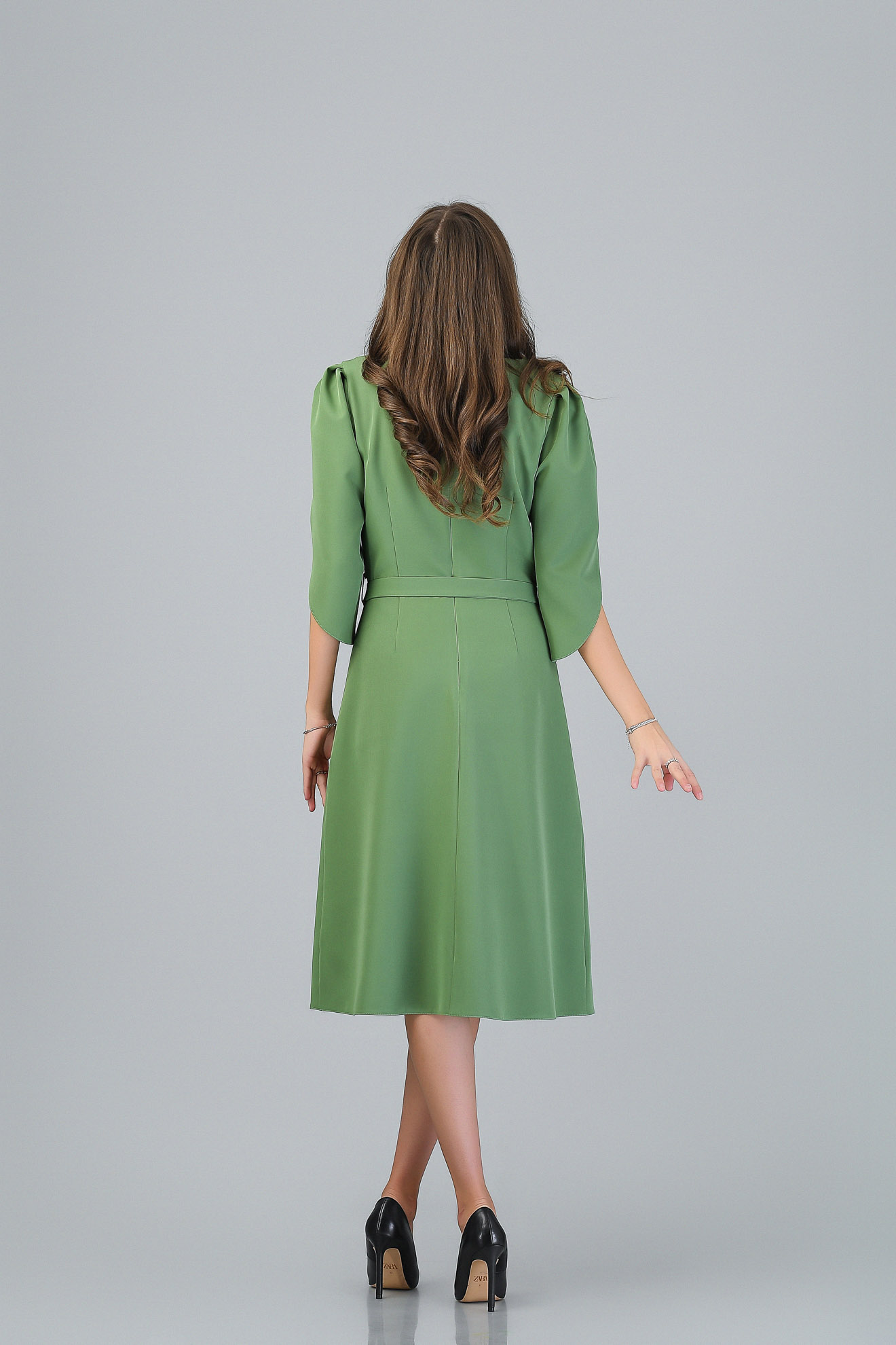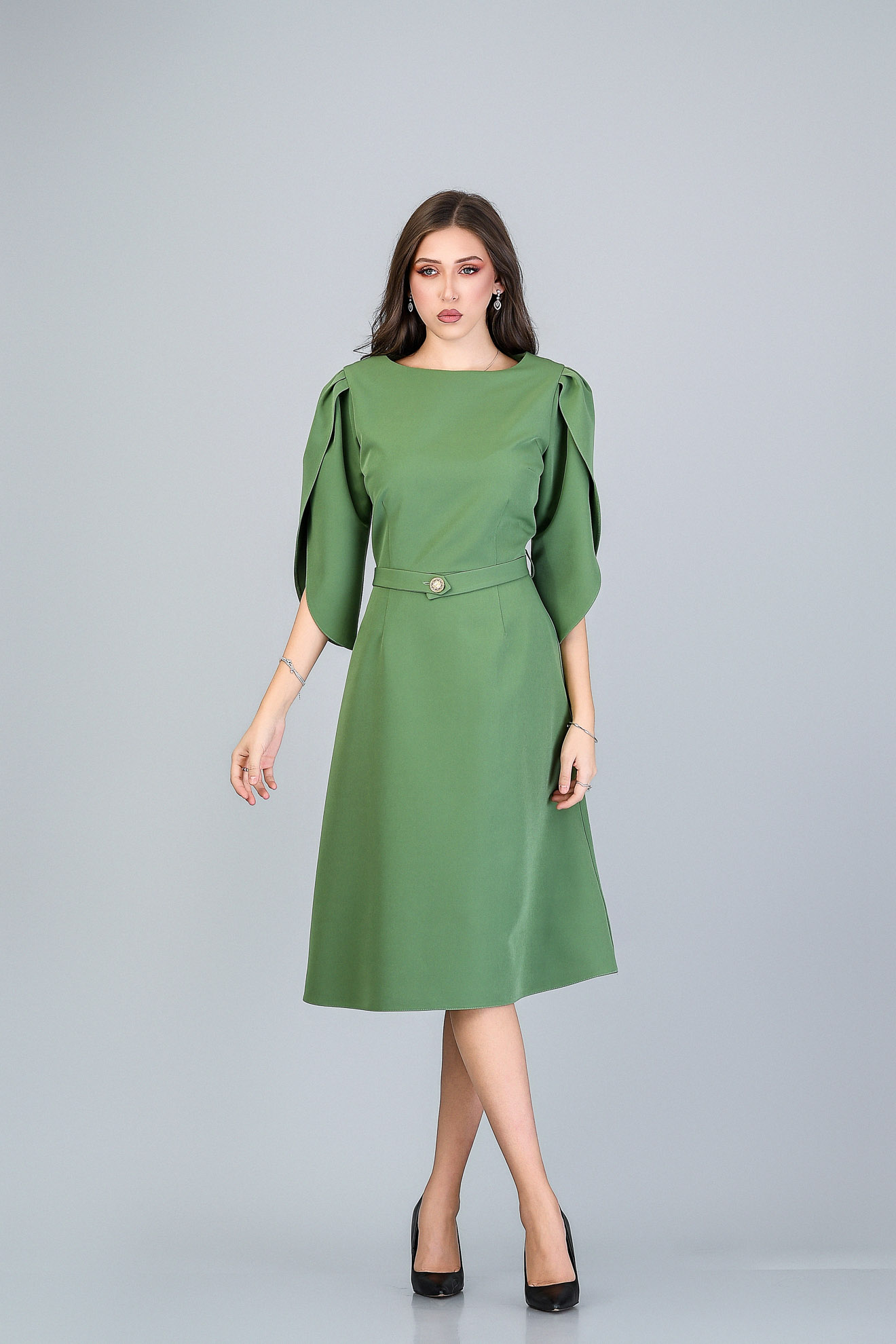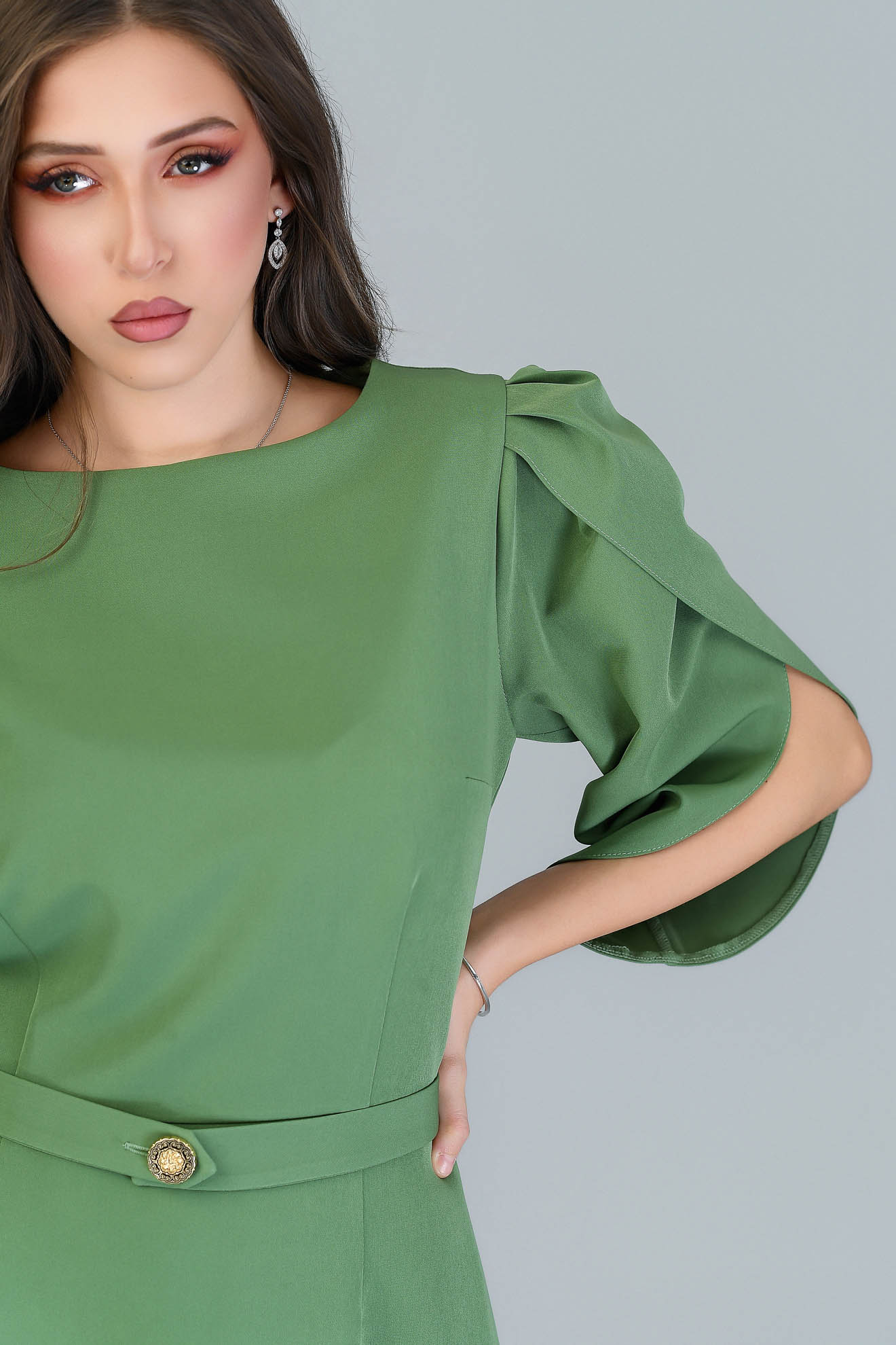 Confecționată din stofă, în croi lejer, căptușită cu vâscoză, cu mâneci suprapuse în forma de lalea, accesorizată cu cordon în talie și nasture auriu.
