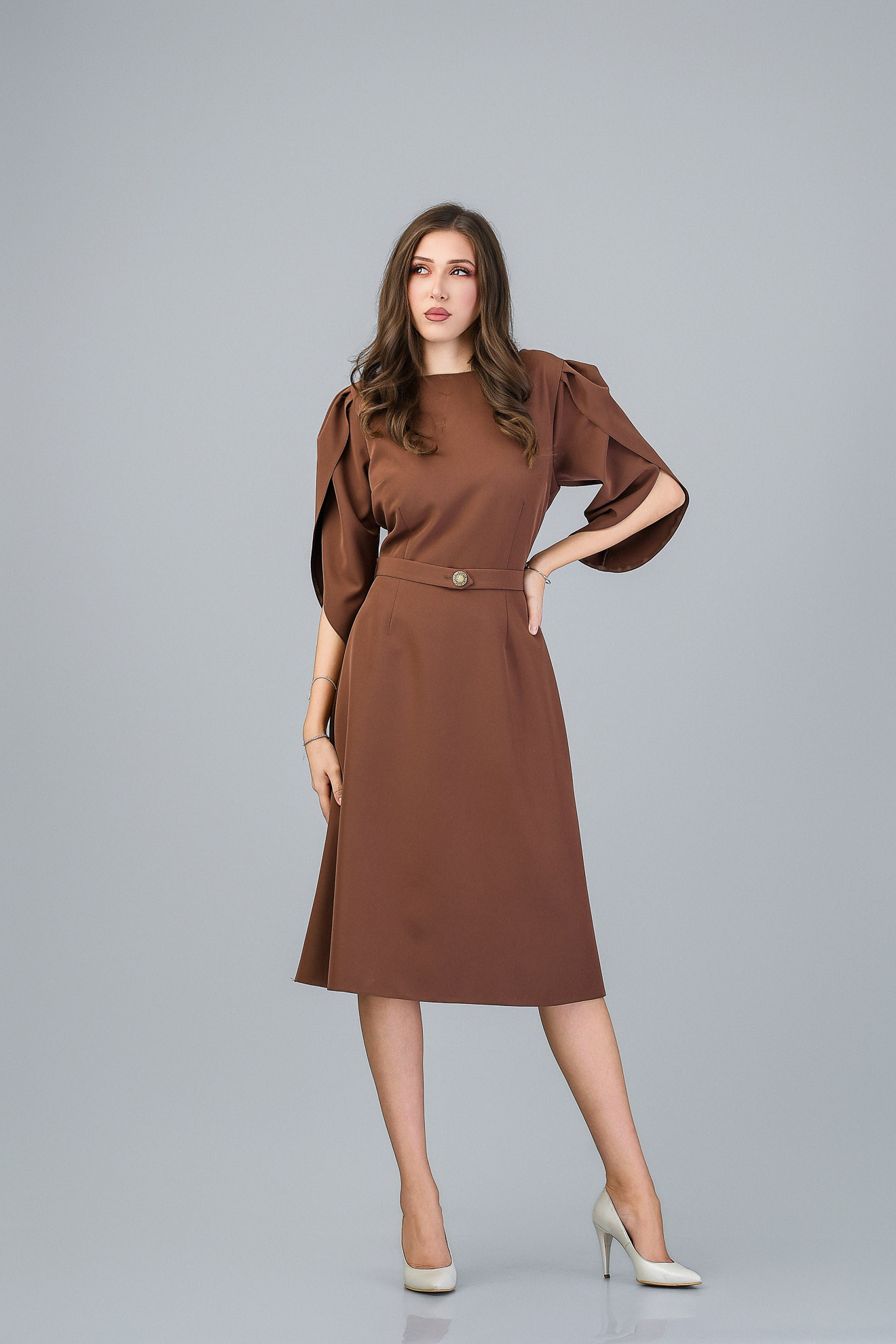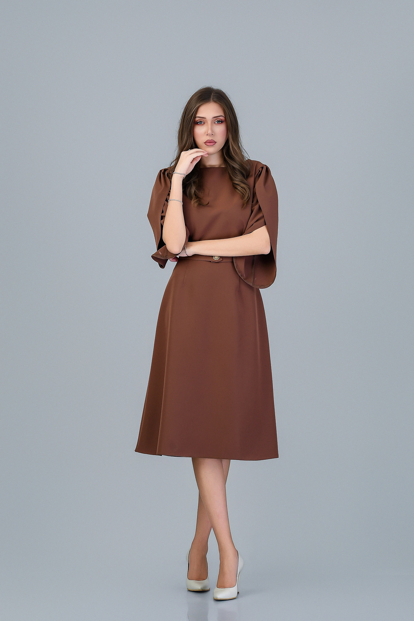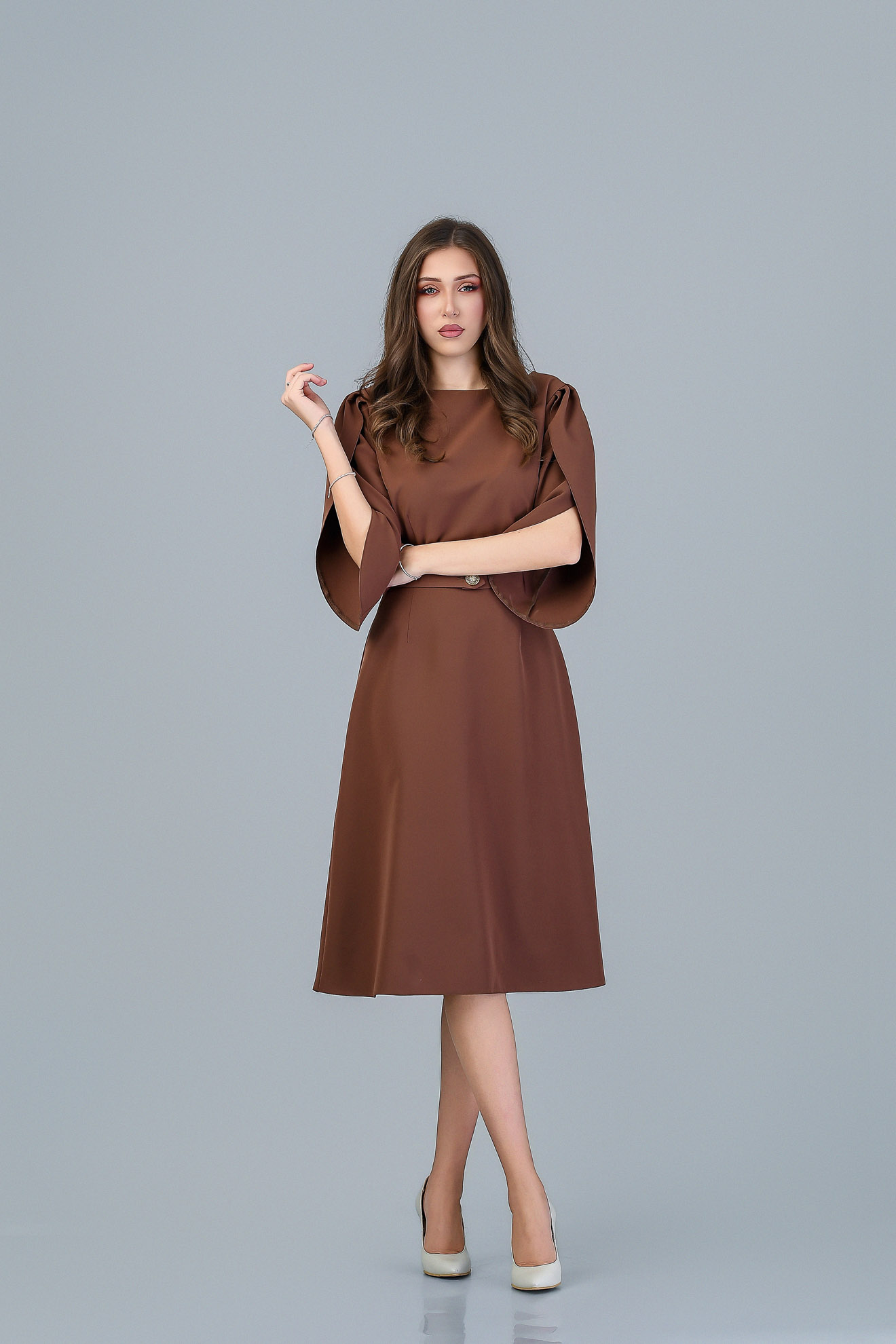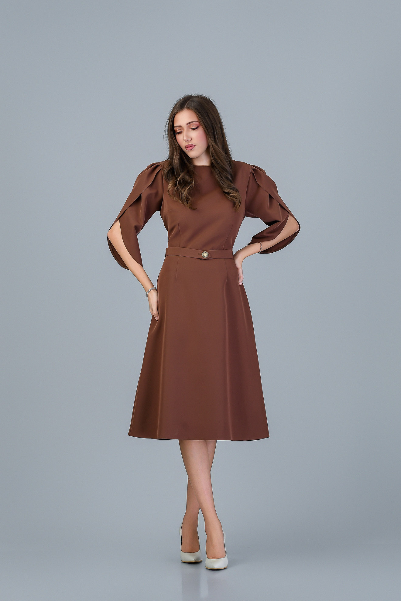 Confecționată din stofă, în croi lejer, căptușită cu vâscoză, cu mâneci suprapuse în forma de lalea, accesorizată cu cordon în talie și nasture auriu.