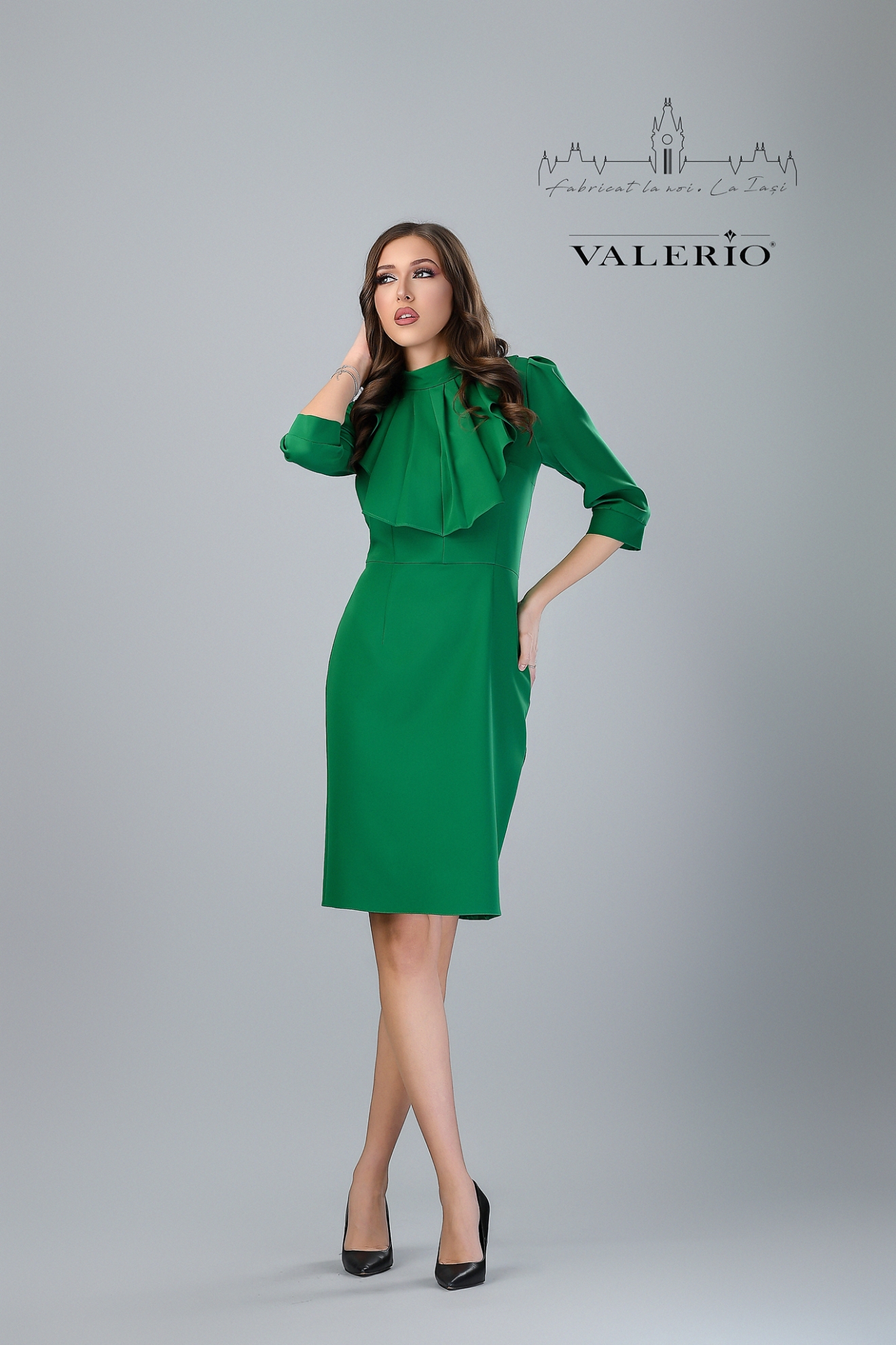 Confecționată din stofă ușor elastică, în croi cambrat, pe lângă gât, accesorizată cu jabou, se încheie la spate cu fermoar ascuns.