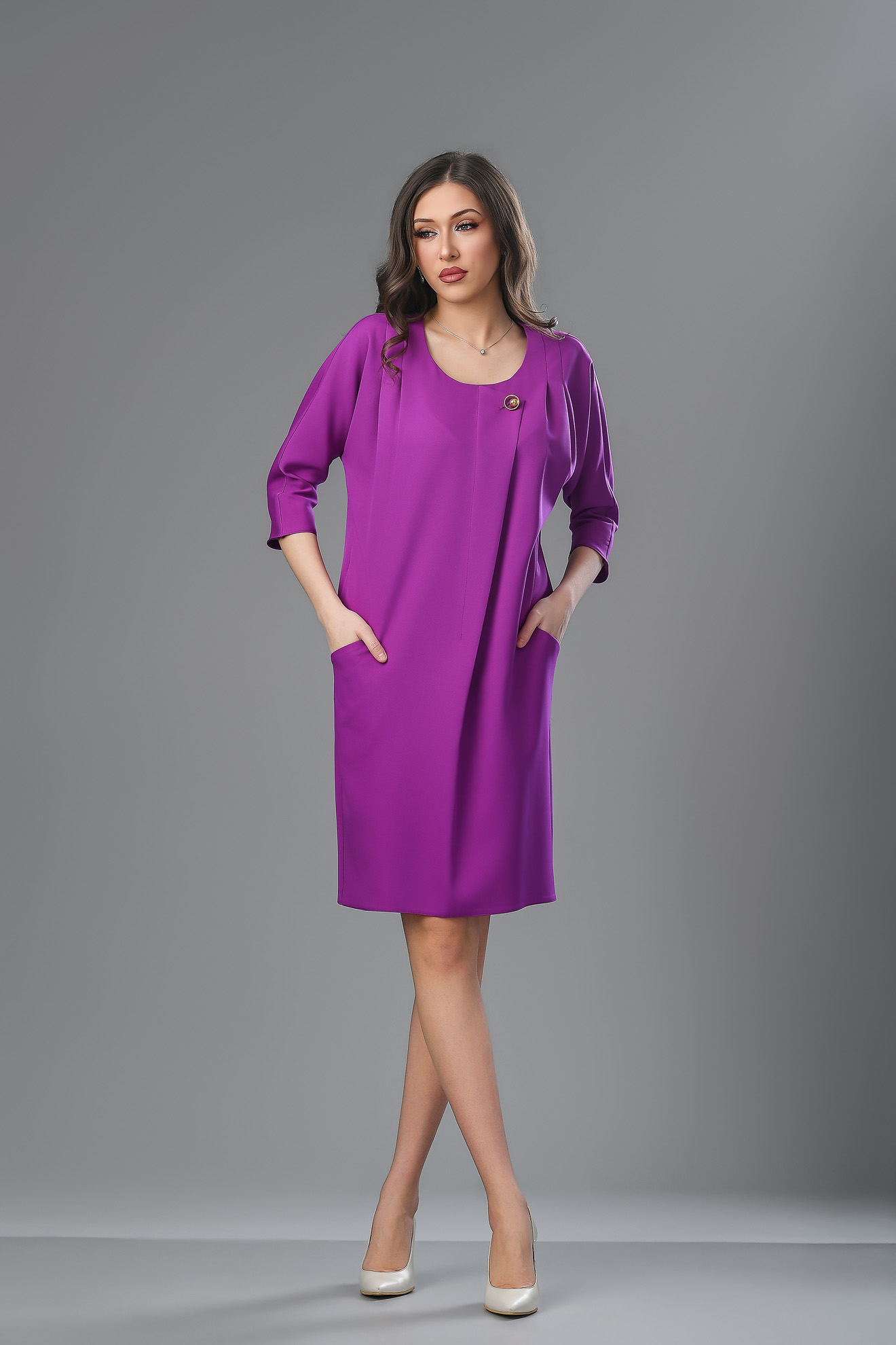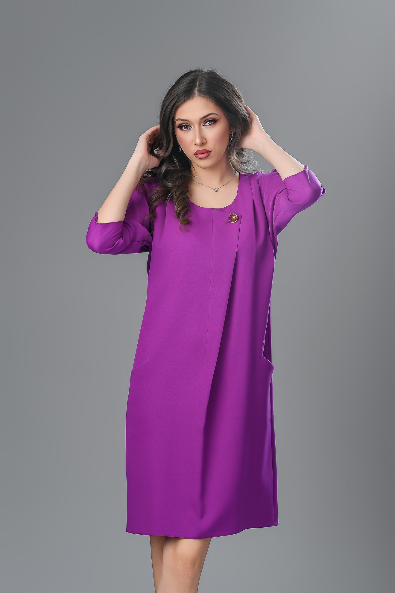 Confecționată din țesătură subțire, în croi lejer, mâneca 3/4, decolteu rotunjit la baza gâtului, prevăzută cu buzunare, se încheie la spate cu fermoar ascuns.