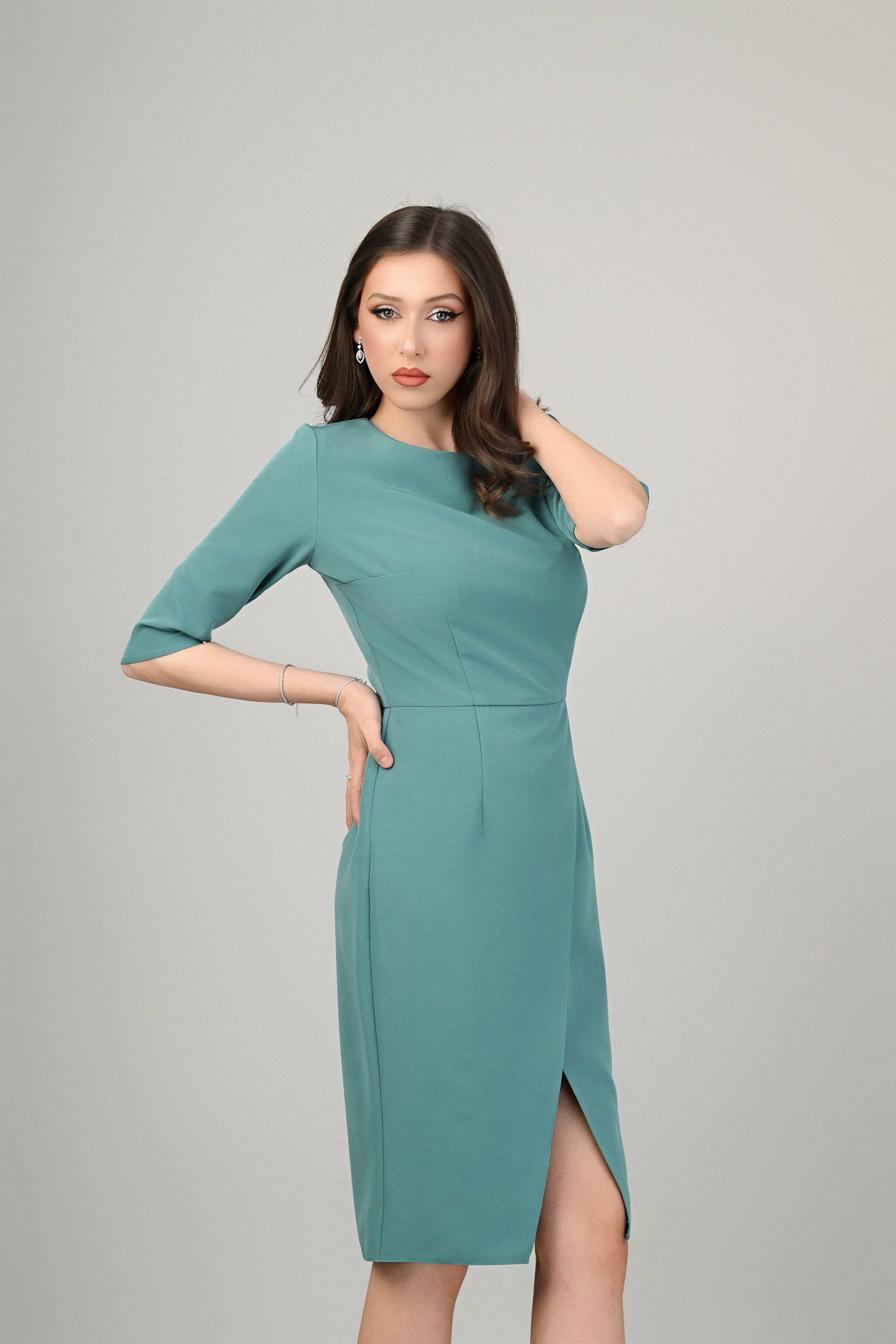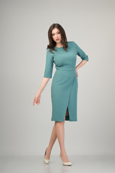 Confecționată din stofă ușor elastică în croi cambrat, parte peste parte cu decolteu rotunjit la baza gâtului, căptușită cu vâscoză, se încheie la spate cu fermoar ascuns.