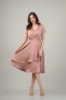 Confecționată din satin subțire în croi lejer, cloș, cu decolteu în V, căptușită cu vâscoză, se încheie la spate cu fermoar ascuns, accesorizată cu fâșii din același material poziționate pe talie.