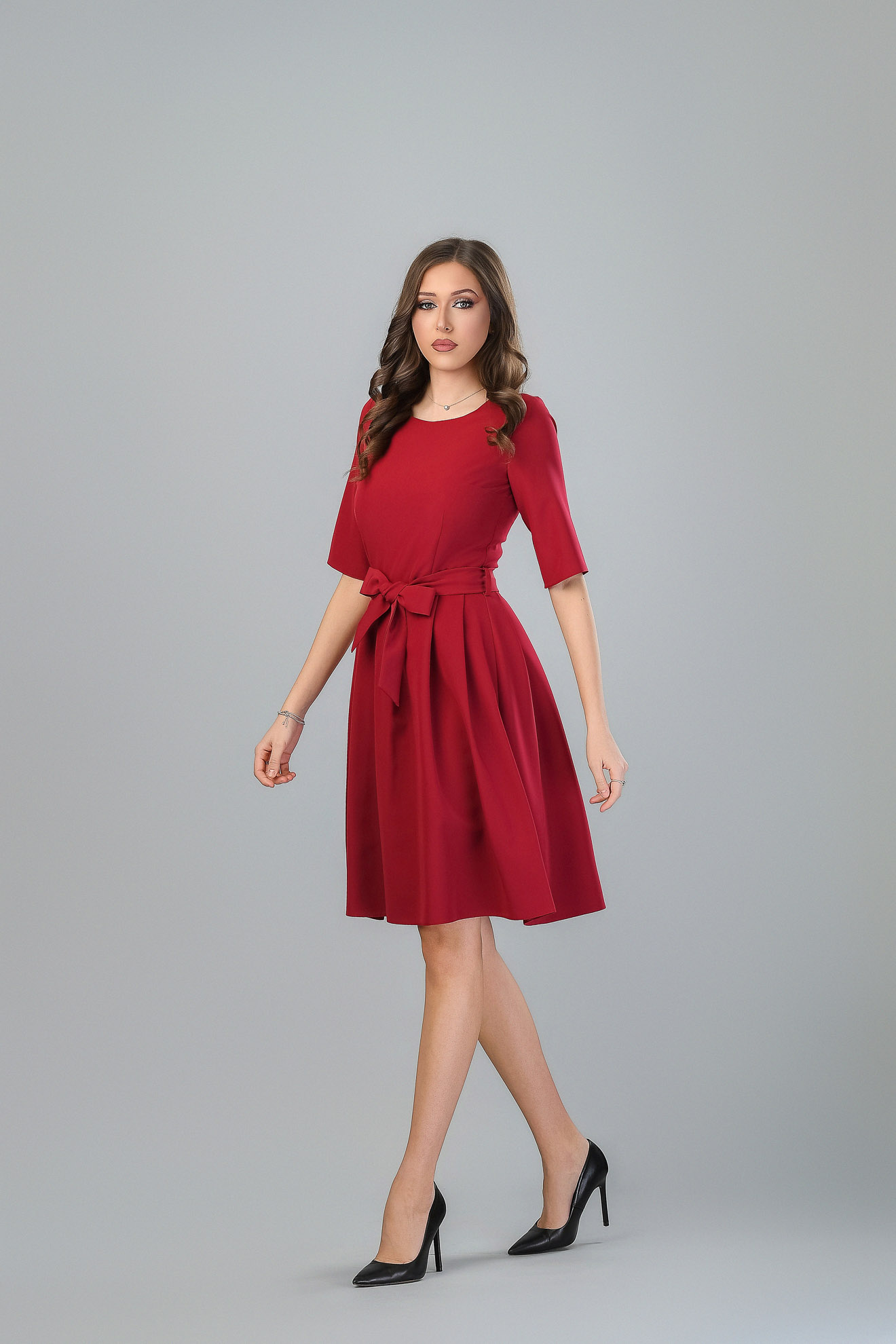 Confecționată din stofă ușor elastică, în croi lejer, poala fiind prevăzută cu pliuri mari, decolteu rotunjit la baza gâtului, accesorizată cu cordon in talie, se încheie la spate cu fermoar ascuns.