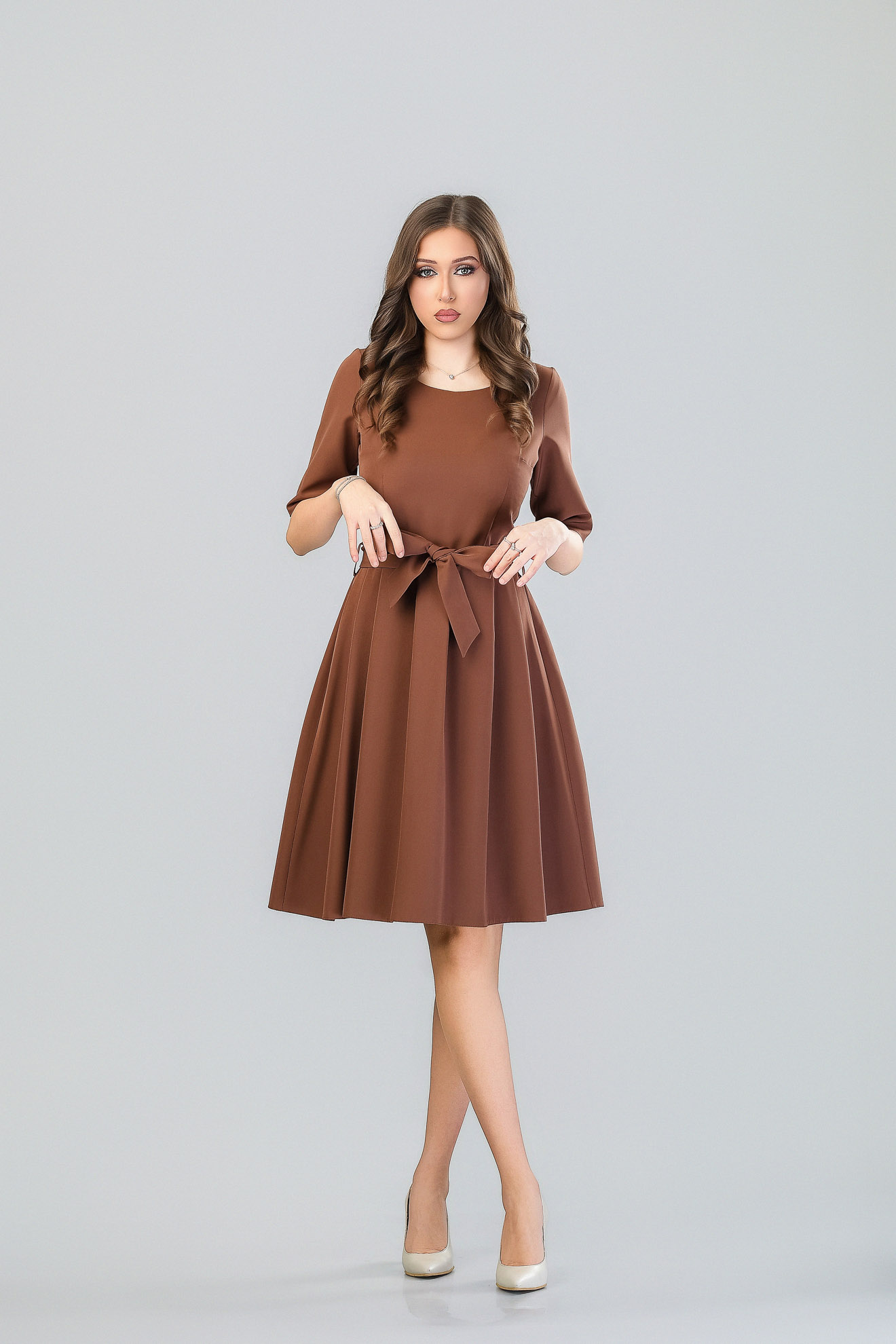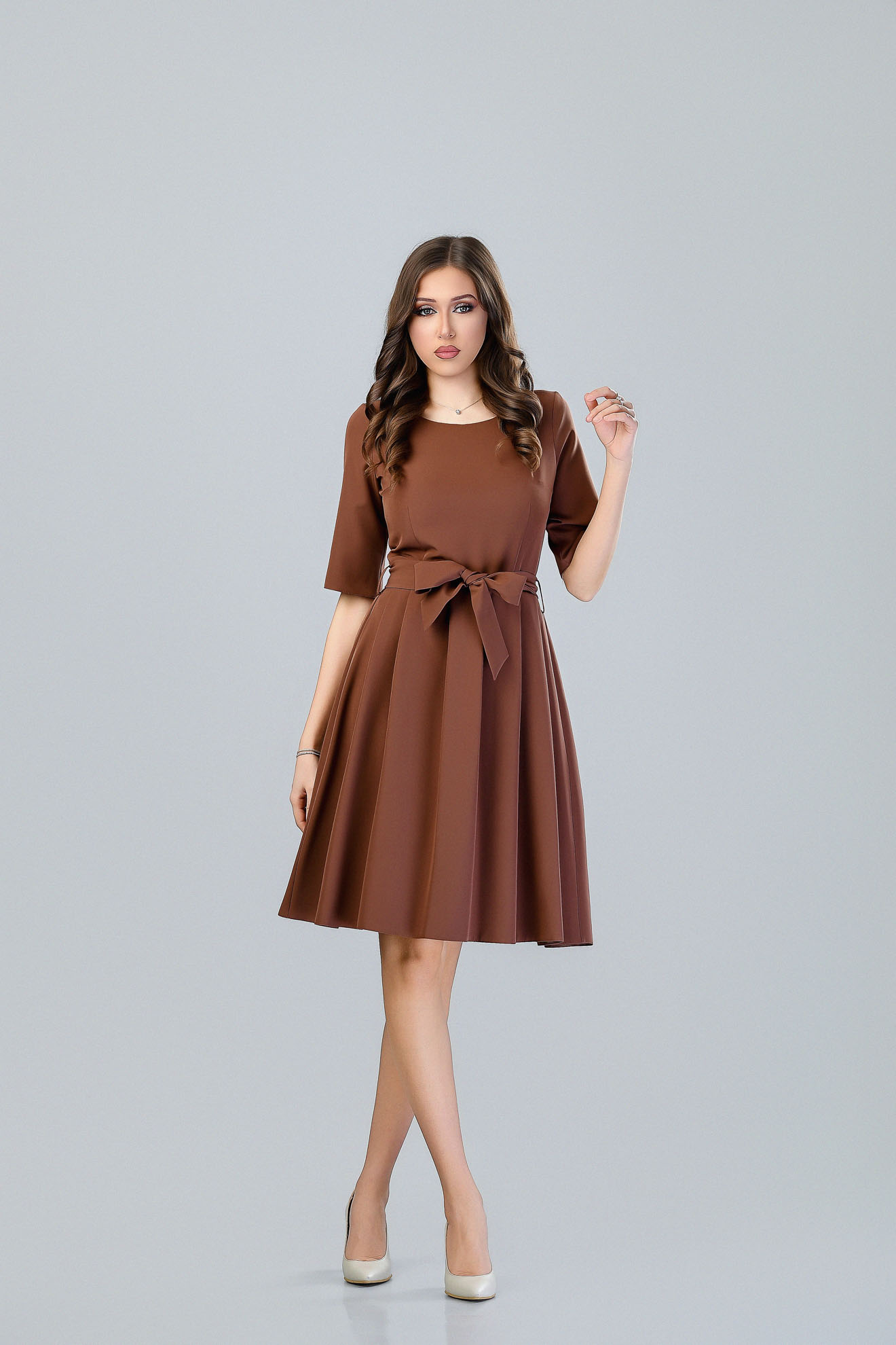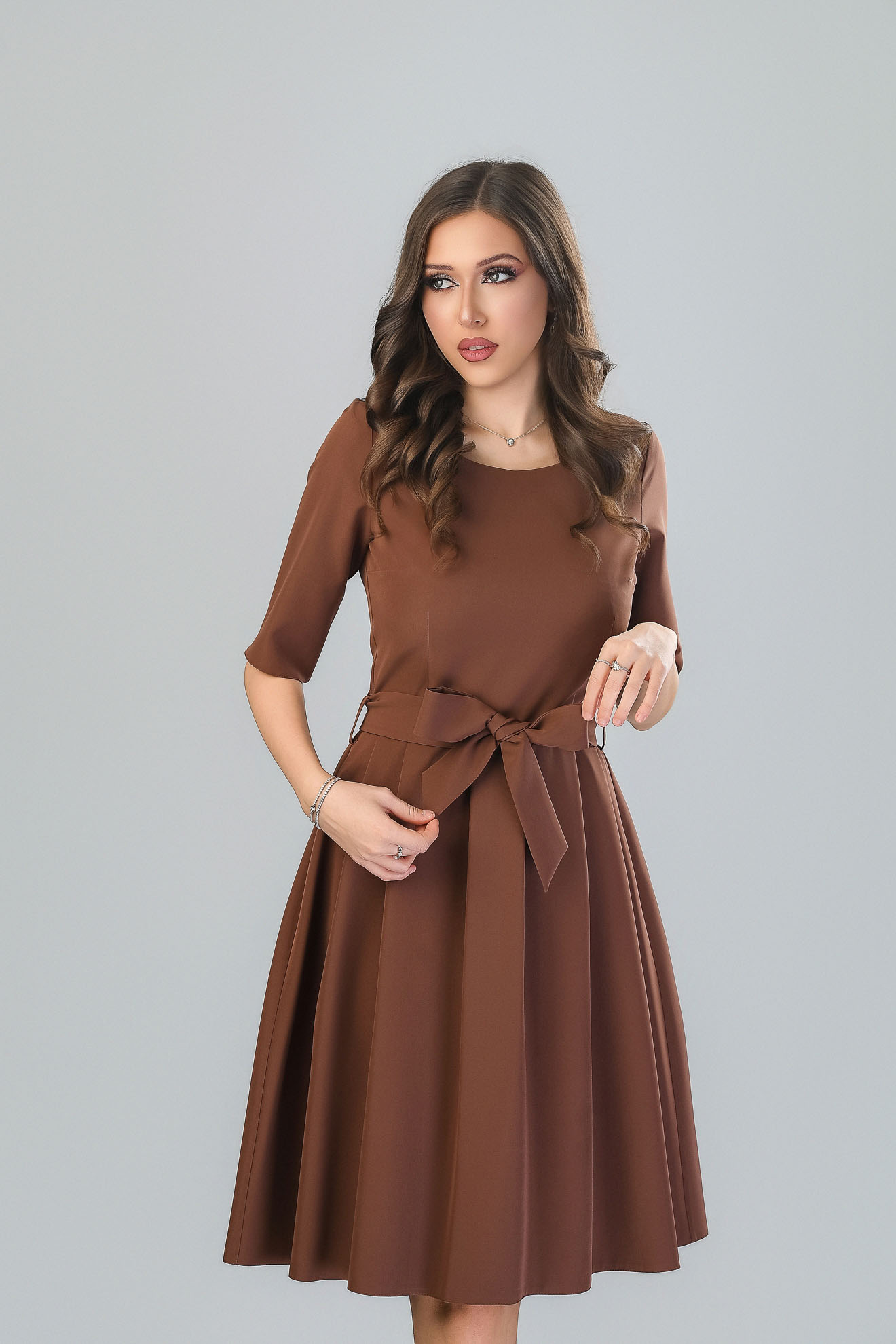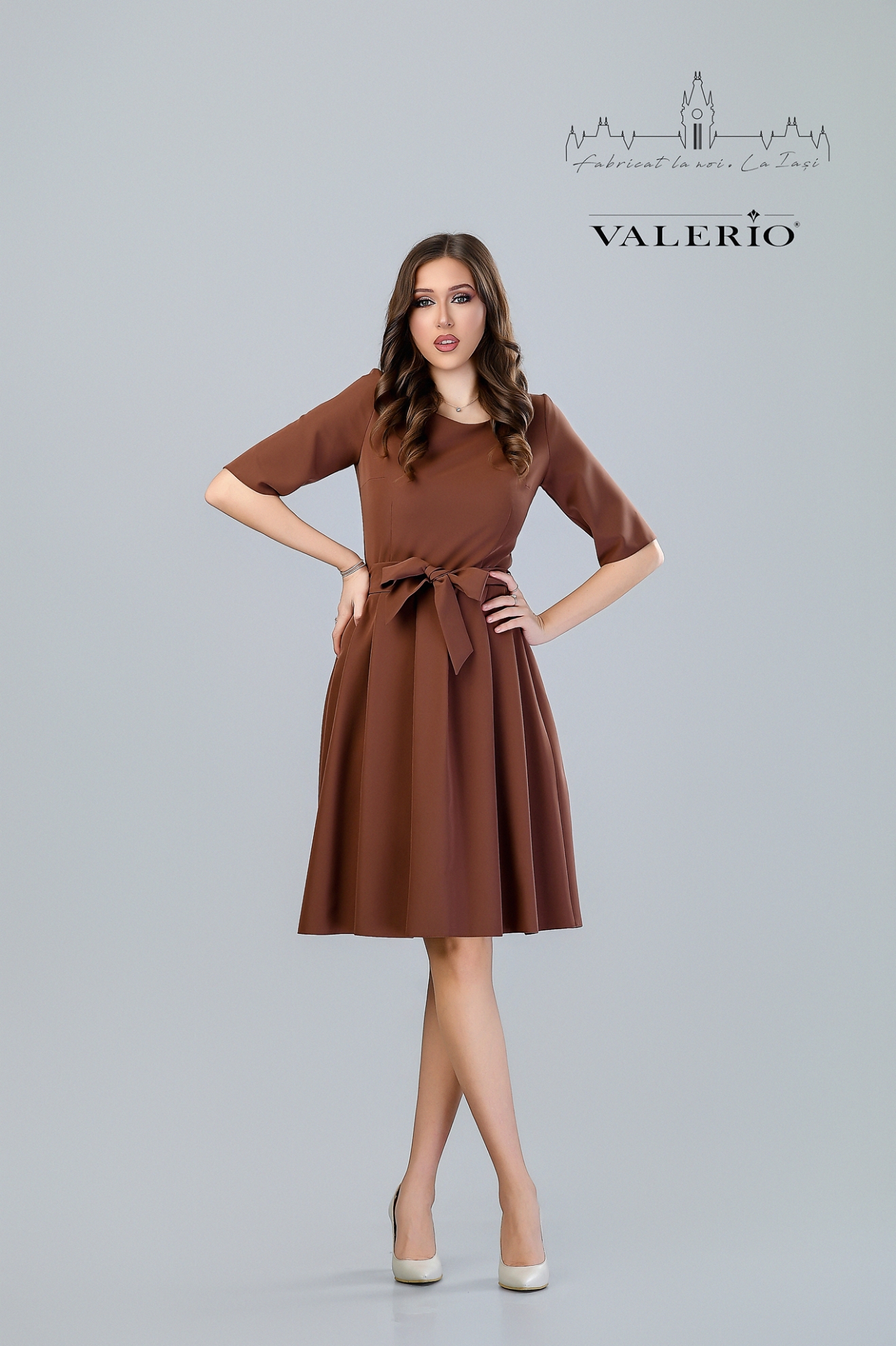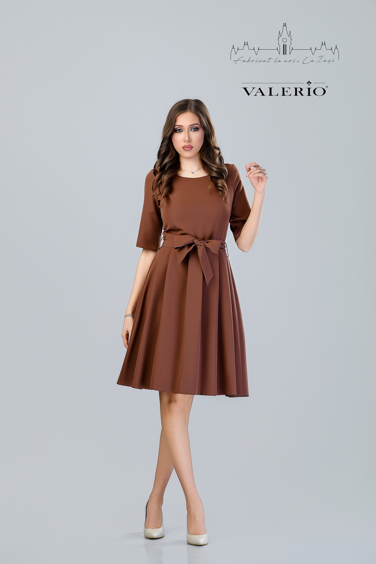 Confecționată din stofă ușor elastică, în croi lejer, poala fiind prevăzută cu pliuri mari, decolteu rotunjit la baza gâtului, accesorizată cu cordon in talie, se încheie la spate cu fermoar ascuns.