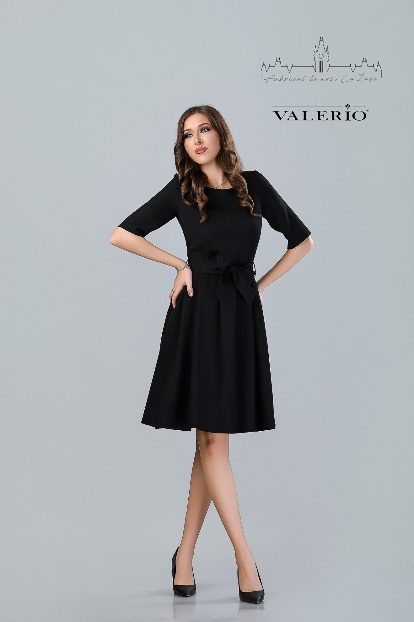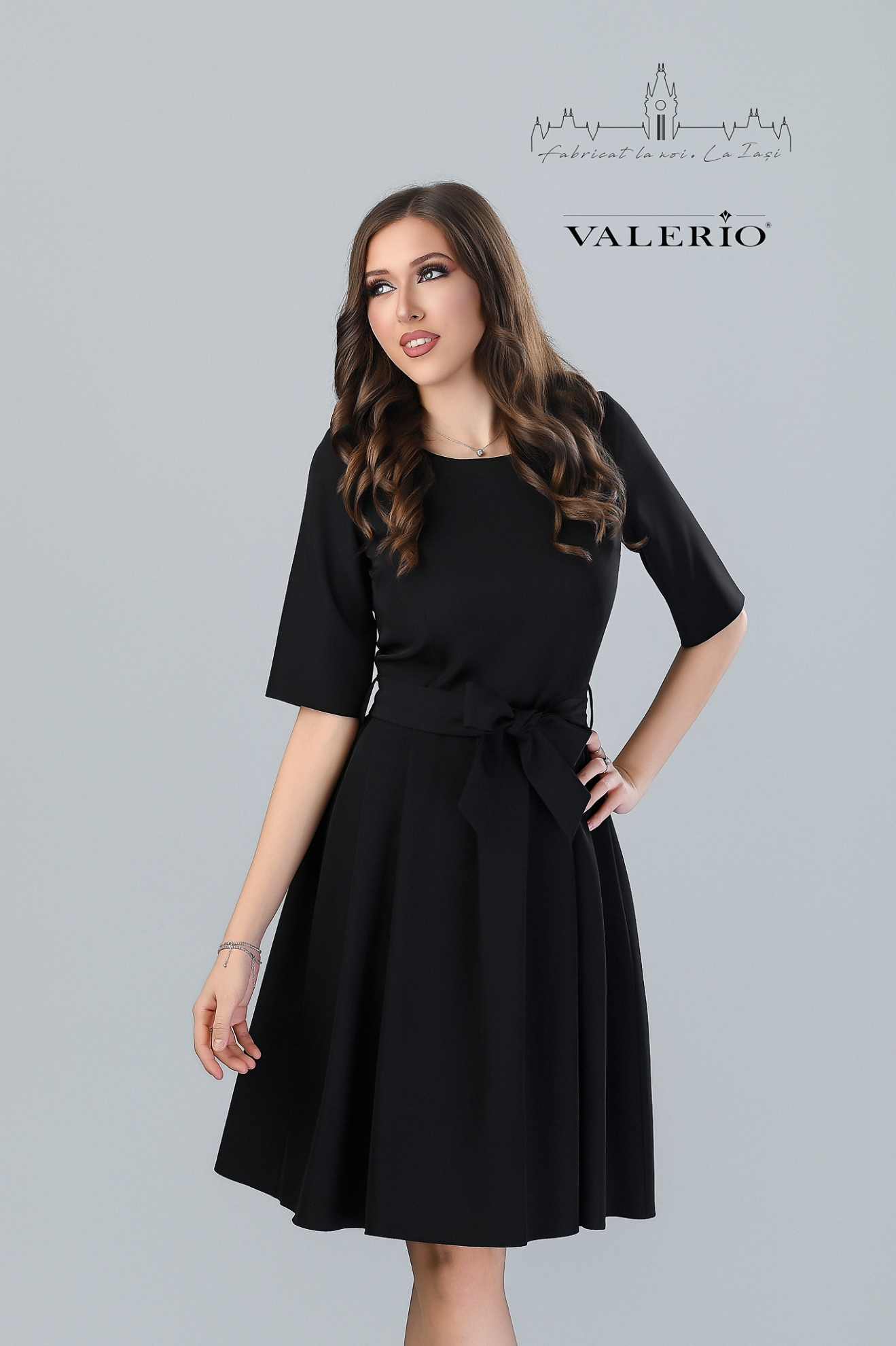 Confecționată din stofă ușor elastică, în croi lejer, poala fiind prevăzută cu pliuri mari, decolteu rotunjit la baza gâtului, accesorizată cu cordon in talie, se încheie la spate cu fermoar ascuns.