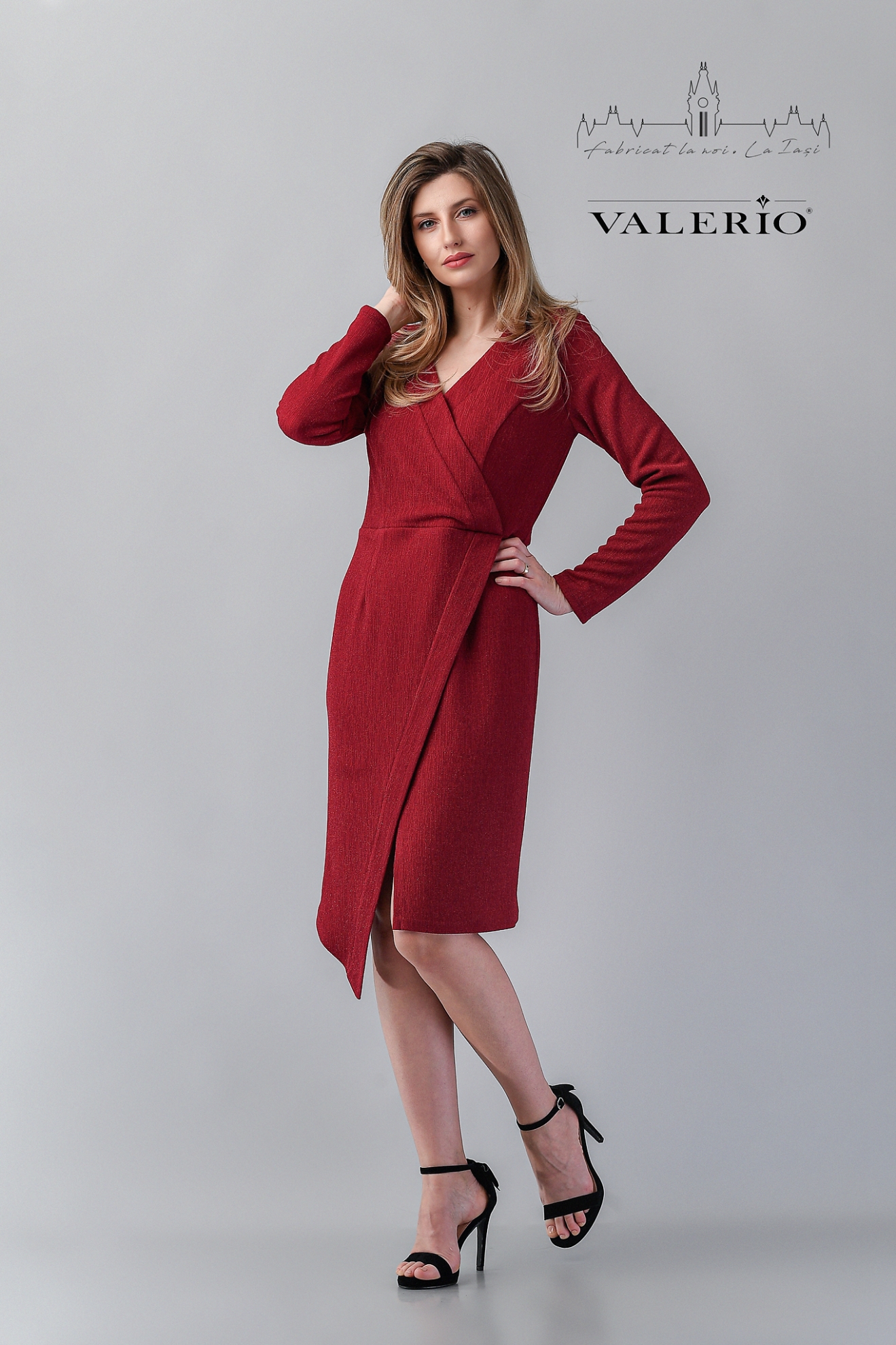 Confecționată din țesătură elastică, în croi cambrat, asimetrică, parte peste parte, cu decolteu în V, se încheie la spate cu fermoar ascuns.