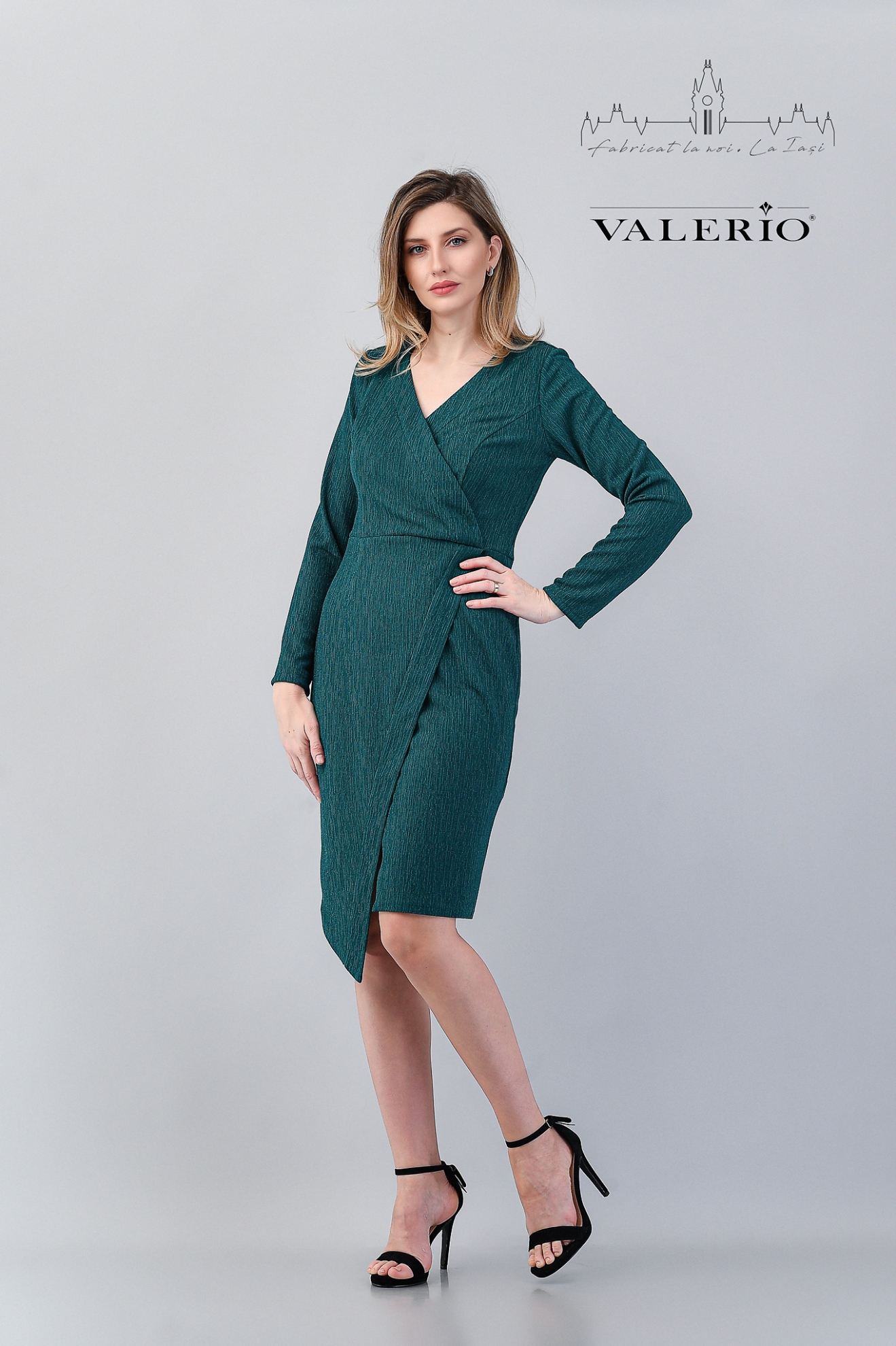 Confecționată din țesătură elastică, în croi cambrat, asimetrică, parte peste parte, cu decolteu în V, se încheie la spate cu fermoar ascuns.