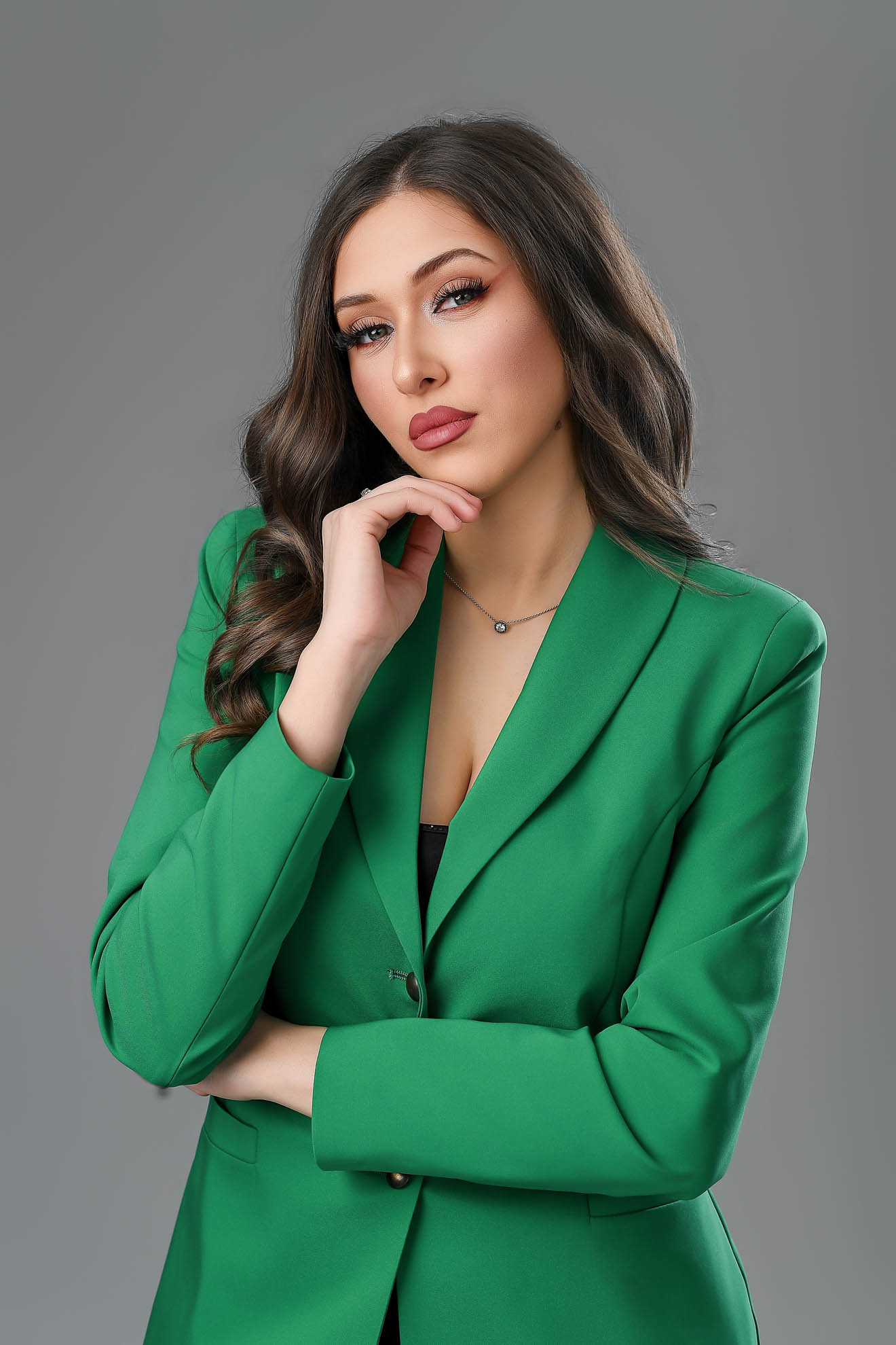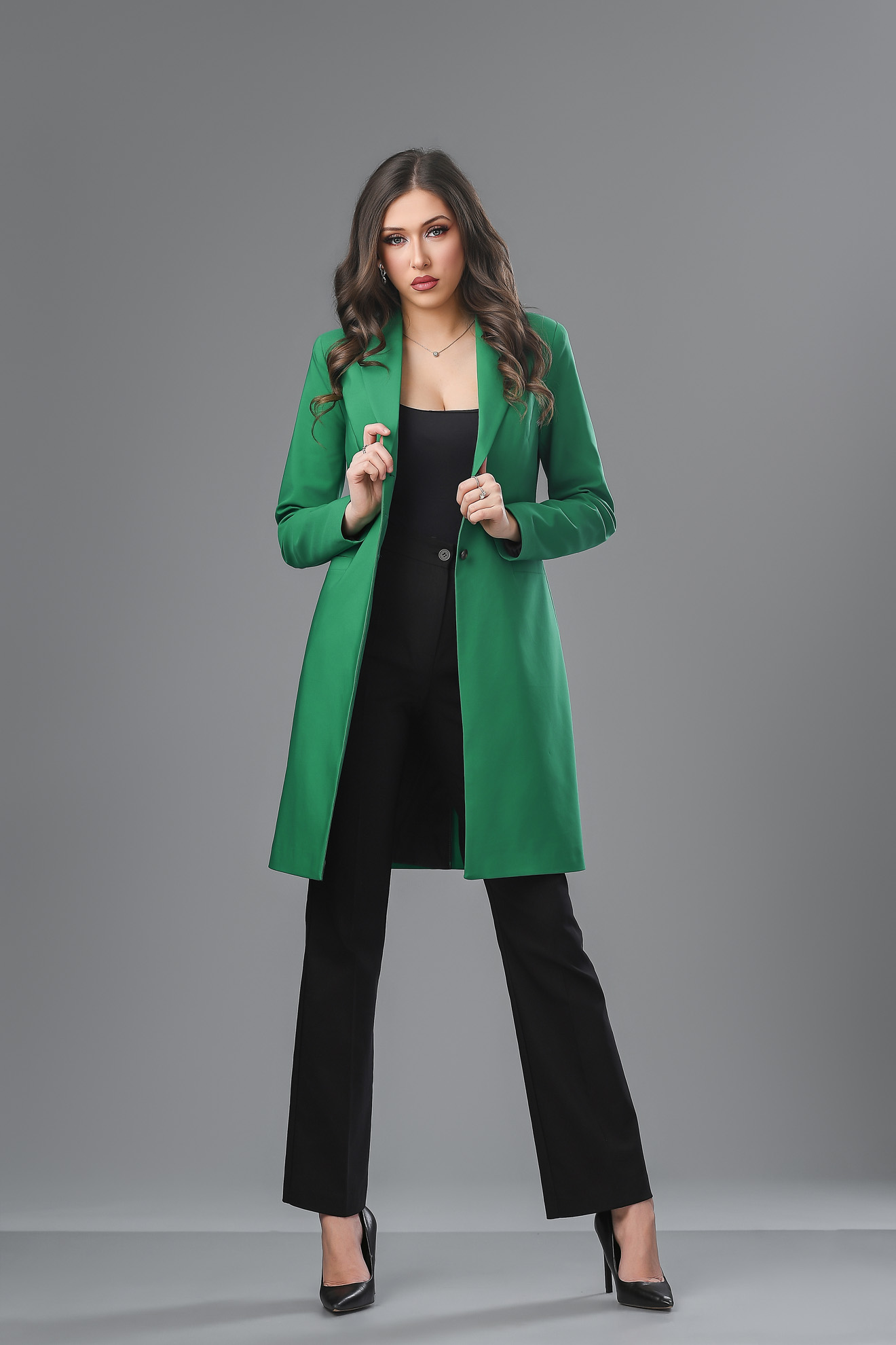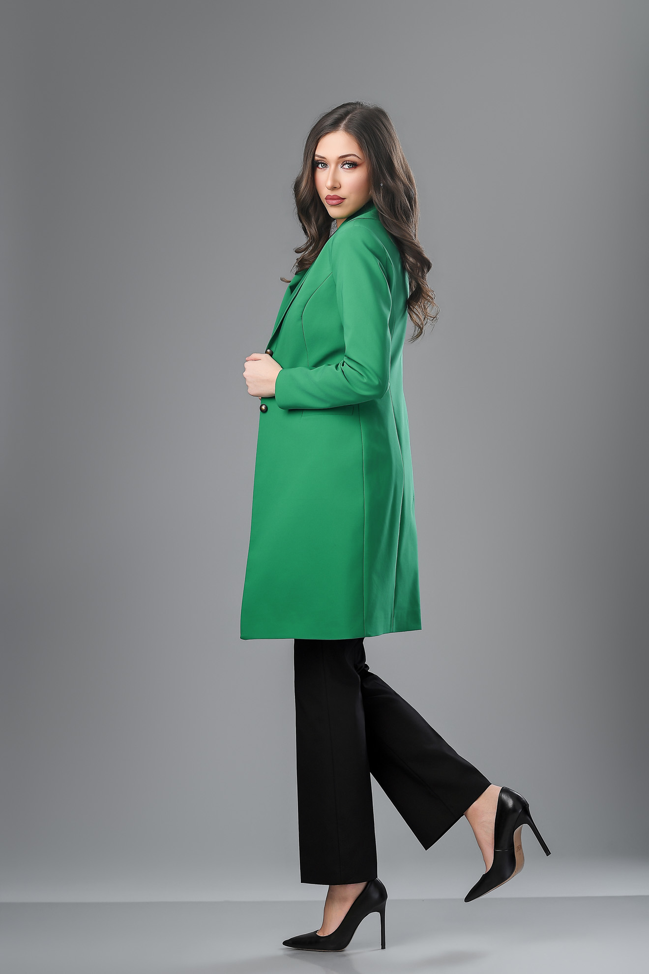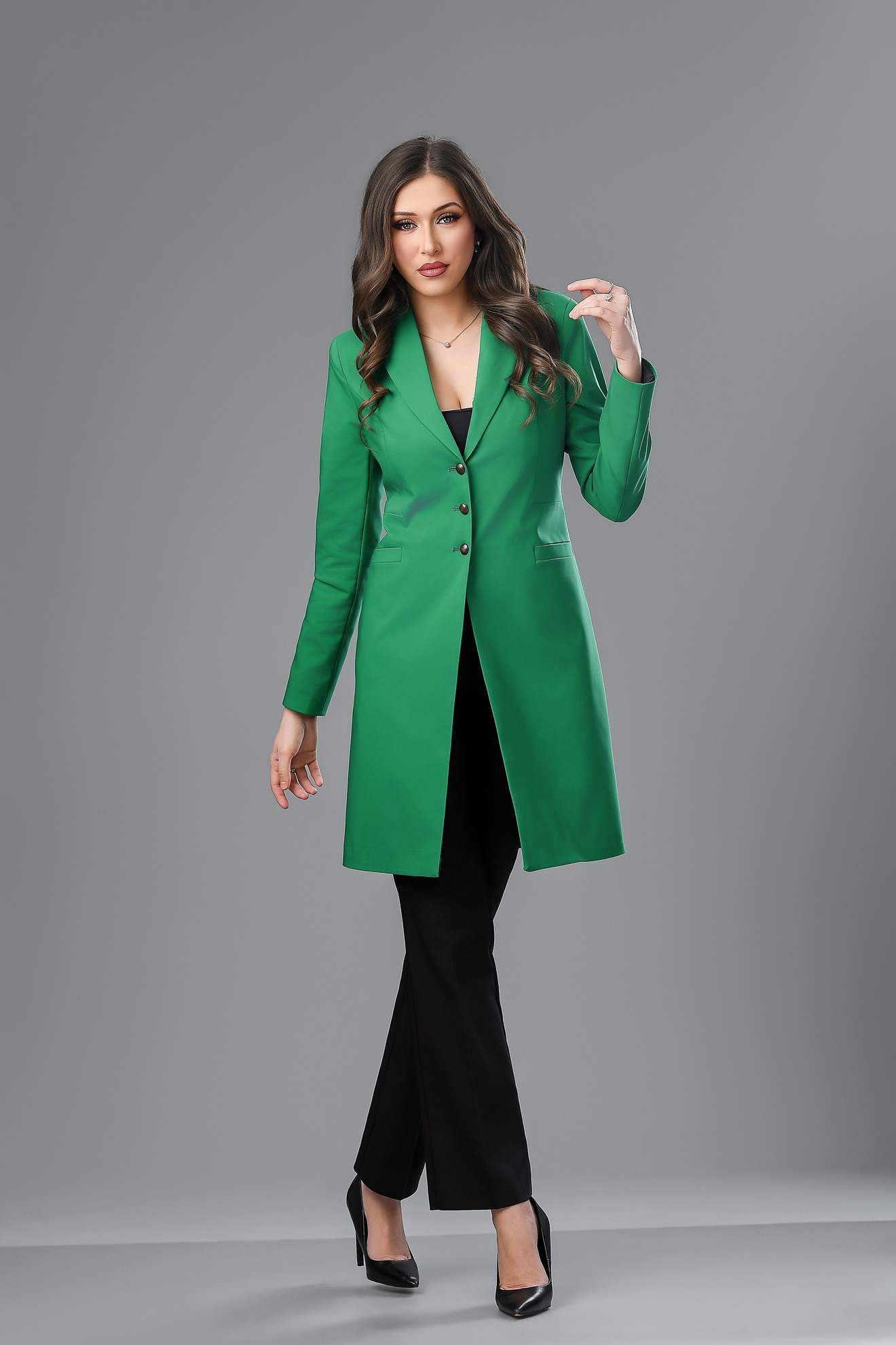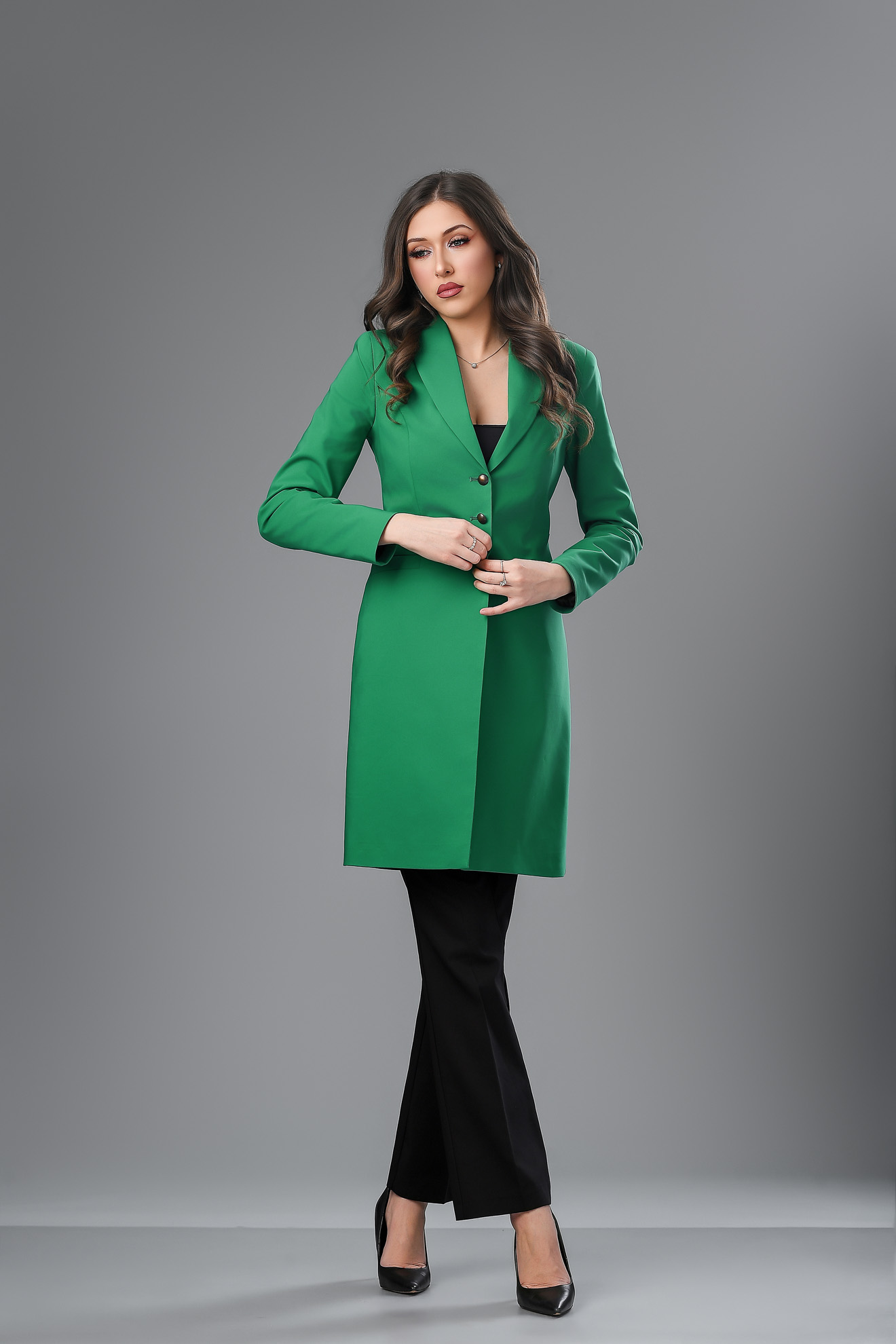 Confecționat din țesătură de calitate superioară, căptușit, în croi cambrat, prevăzut cu buzunare, șliț, se încheie în trei nasturi.