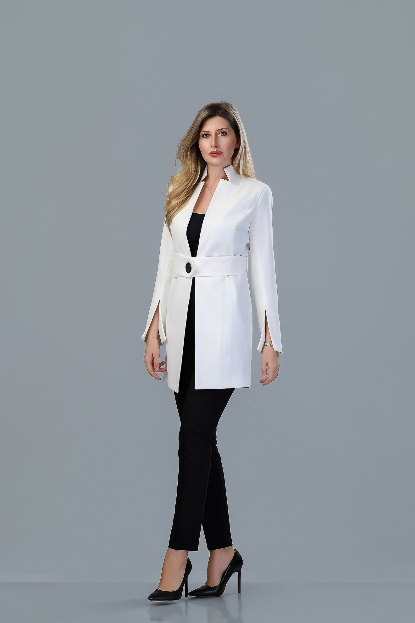 Confecționat din țesătură de calitate, catifelat, căptușit, în croi cambrat, accesorizat cu o curea din aceeași țesătură care se încheie cu un nasture.