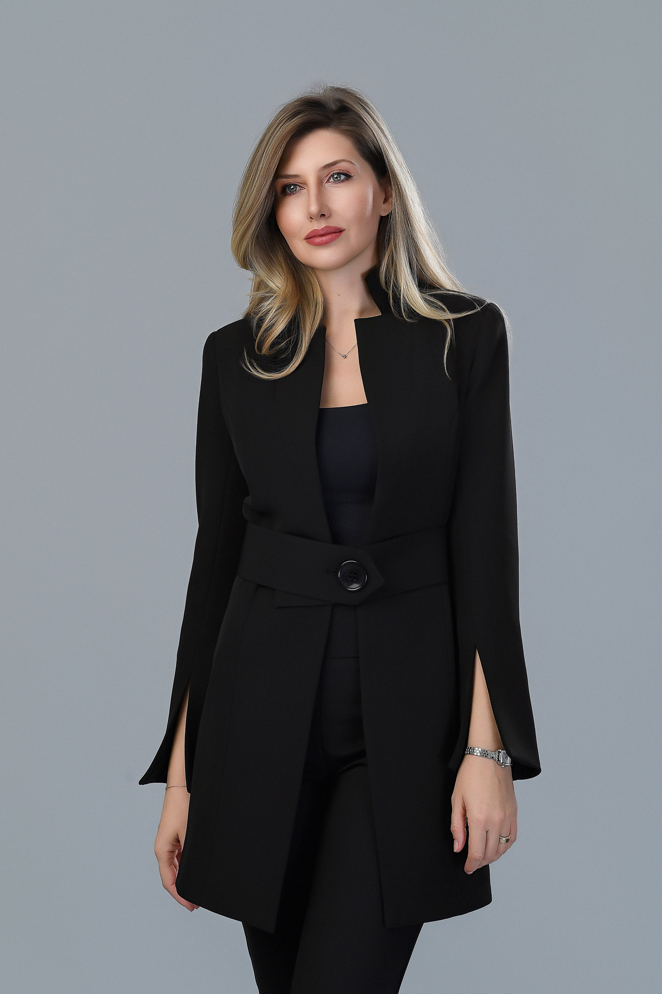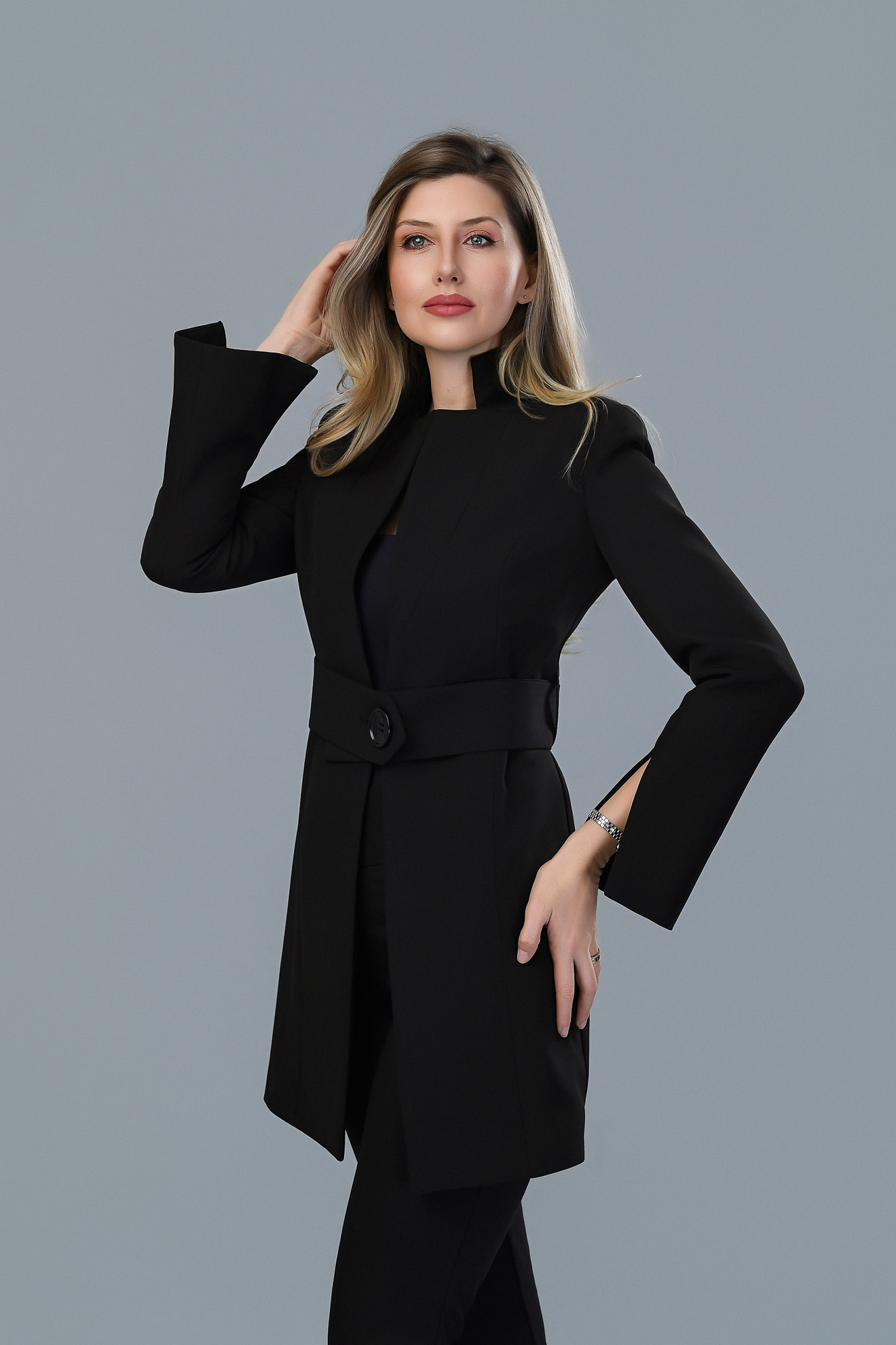 Confecționat din țesătură de calitate, catifelat, căptușit, în croi cambrat, accesorizat cu o curea din aceeași țesătură care se încheie cu un nasture.